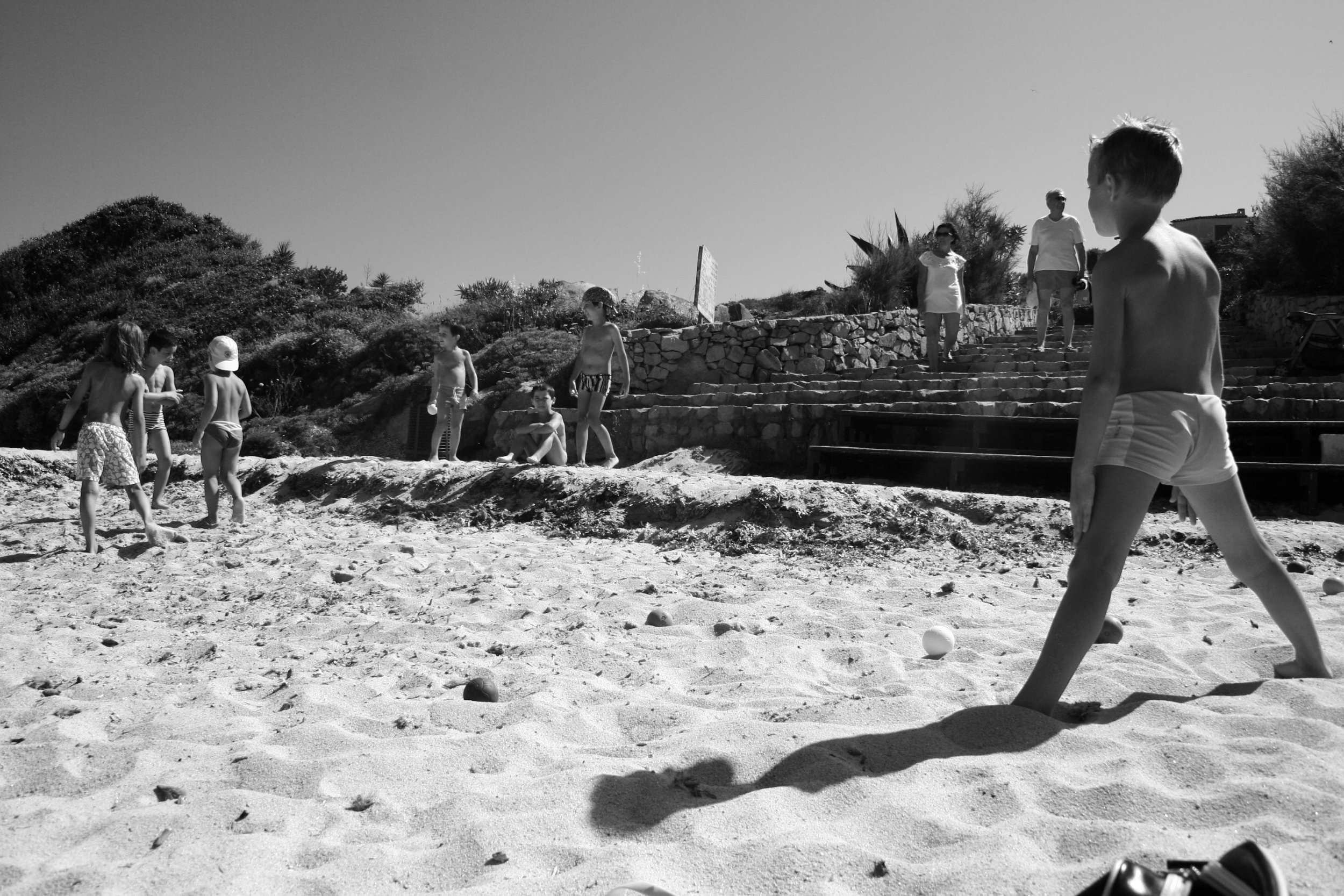 Bella fotografia che racconta di giochi sulla spiaggia di bambini. Nella presunta "banalità" sta il coinvolgimento dello spettatore perchè anche lui ha avuto esperienze del genere, da piccolo. La spiaggia sembra appartenere al litorale romano e sono pregevoli sia la ripresa dell'ombra sia la scelta del b/n che mi rammenta la famosa frase pronunciata dal fotografo Marciano:"Il colore è per l'attualità, il b/n per l'eternità". E' tra le mie preferite!