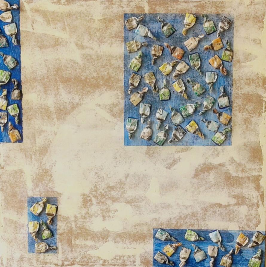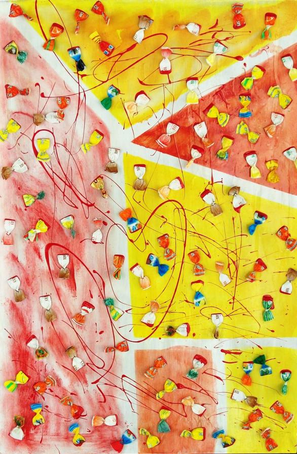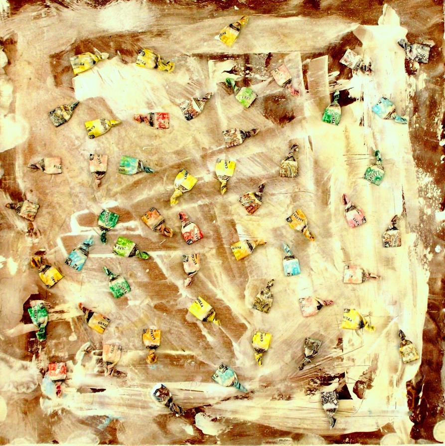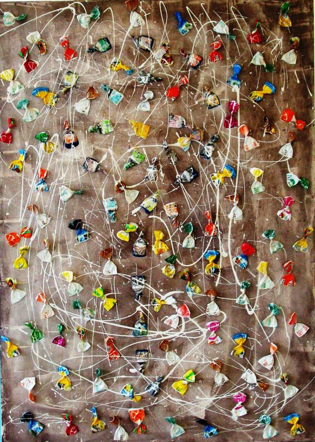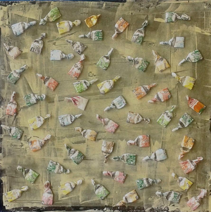 Circa 6 anni fa , un'estate del 2009, mentre facevo jogging, , camminando lungo un percorso ciclabile, ai margini di una strada del paese dove vivo , mi sono imbattuto, con lo sguardo, su un cumulo di quadratini colorati , simili a piccole piastrelle, a tasselli di un mosaico, giacenti in ordine sparso ,in un piccolo fossato .Incuriosito, mi sono chinato per verificarne la natura e la consistenza e, con mia sorpresa, ho realizzato che si trattava di carte di caramelle colorate ripiegate su sé stesse in maniera precisa e meticolosa, da risultare una sorta di quadratino con un appendice finale. Mi avevano colpito per la loro peculiarità estatica, la precisione della forma, la superficie cromatica, uguale e al tempo stessa diversa,che contraddistingueva ciascuna caramella, il cui involucro era ripiegato con sapienza e precisione e poi abbandonata n un rigagnolo stradale. Erano circa una quarantina di carte di caramelle. Poiché ero solito utilizzare materiale di riciclo, proveniente dall’uso comune, nei mie quadri , ho pensato di raccogliere questo materiale originale per utilizzarlo, all’uopo ,nei mie lavori artistici, quando ne avessi avuto l’’ispirazione. L’attrazione verso quelle carte però fu così viva e immediata che dopo due giorni realizzai il mio primo quadro dedicato ad esse , dalle piccole dimensioni e dalla superficie rosso cromata. Dopo un paio di settimane sono ripassato dallo stesso luogo è con mia sorpresa ho rinvenuto ancora un numero maggiore di carte di caramelle, lasciate nello stesso luogo ripiegate nella stessa maniera di quelle rinvenute precedentemente. Erano lo stesso tipo di caramelle, la stessa tipologia di colori associata a diversi gusti prodotti dalla medesima azienda dolciaria Anche questa volta le ho raccolte con l’intento preciso di farne subito un altro quadro. E così, periodicamente. da allora passo da quel luogo per rinvenire e recuperare quelle carte. Ormai sono anni che questo rito si consuma con le stesse modalità. Da una parte lo sconosciuto mangia le stesse caramelle , le ripiega e le getta in quel selciato e l’artista che periodicamente, ripassa dallo stesso luogo per recuperare degli quelli scarti che diventano materiale costituivo dei suoi lavori artistici.