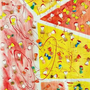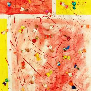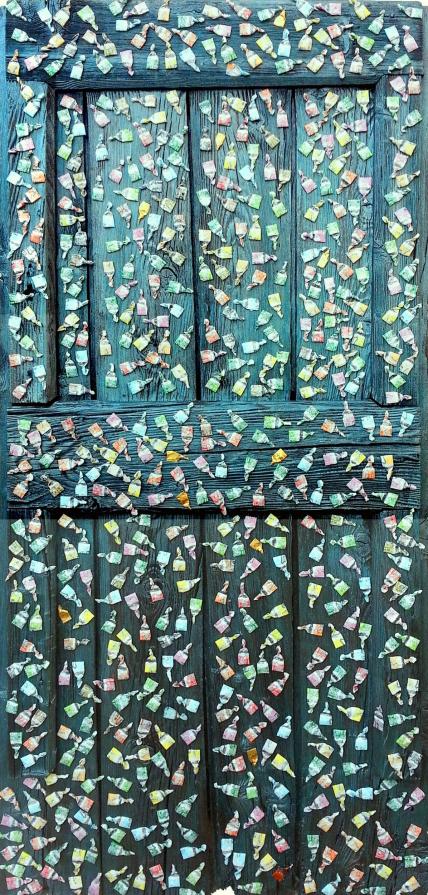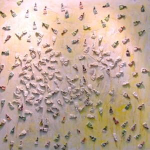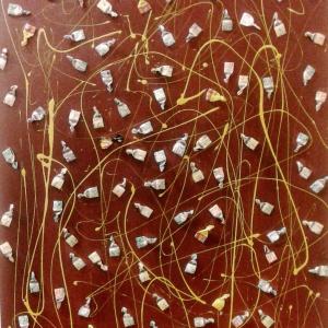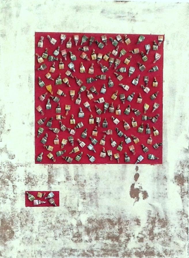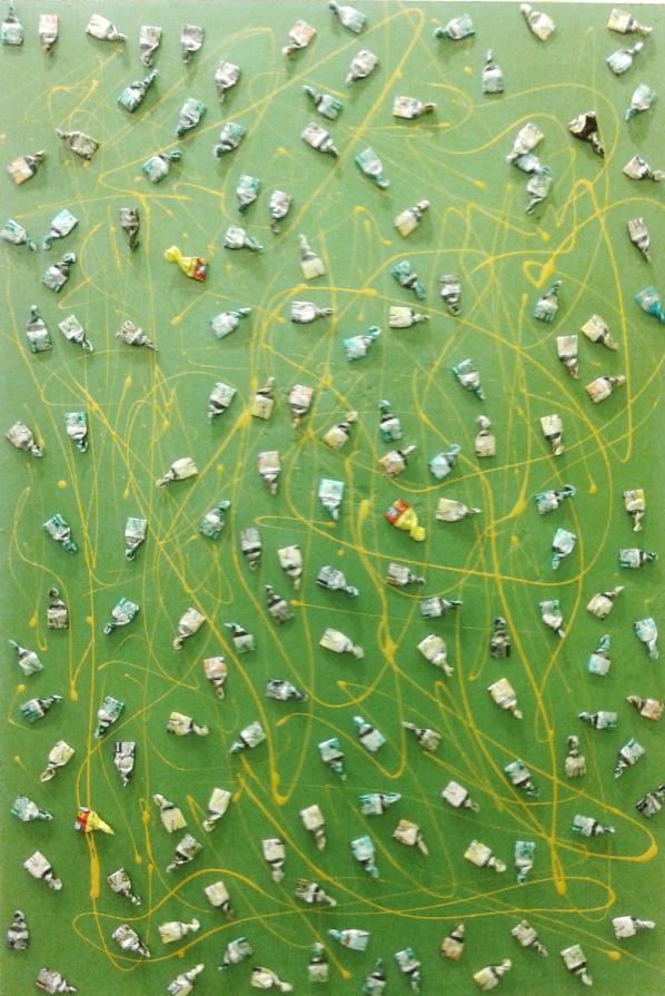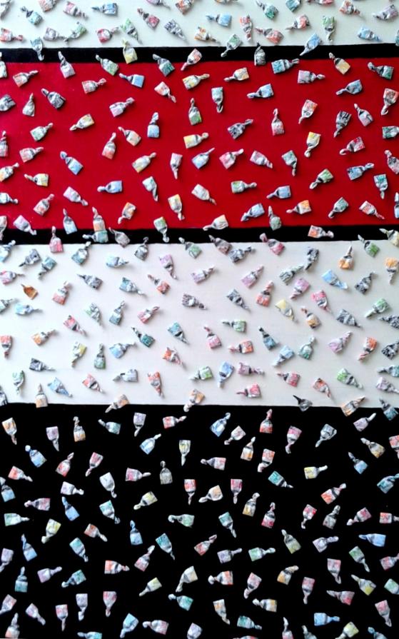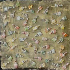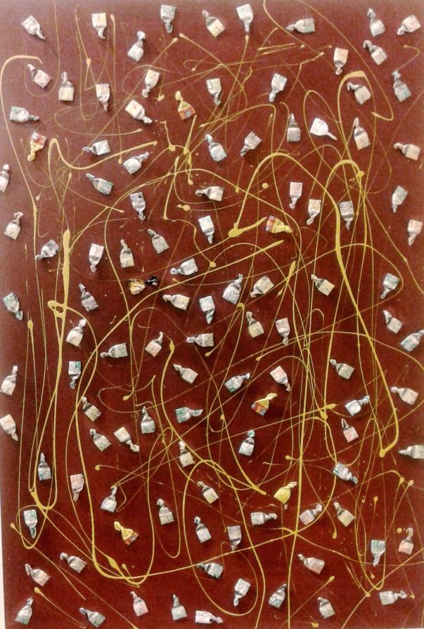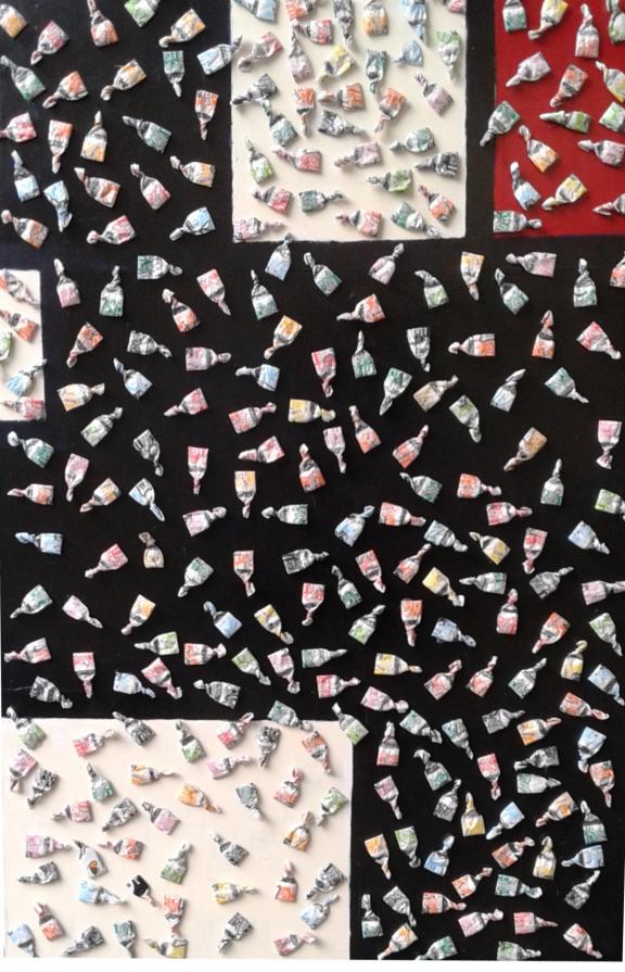 Circa 6 anni fa , un'estate del 2009, mentre facevo jogging, , camminando lungo un percorso ciclabile, ai margini di una strada del paese dove vivo , mi sono imbattuto, con lo sguardo, su un cumulo di quadratini colorati , simili a piccole piastrelle, a tasselli di un mosaico, giacenti in ordine sparso ,in un piccolo fossato .Incuriosito, mi sono chinato per verificarne la natura e la consistenza e, con mia sorpresa, ho realizzato che si trattava di carte di caramelle colorate ripiegate su sé stesse in maniera precisa e meticolosa, da risultare una sorta di quadratino con un appendice finale. Mi avevano colpito per la loro peculiarità estatica, la precisione della forma, la superficie cromatica, uguale e al tempo stessa diversa,che contraddistingueva ciascuna caramella, il cui involucro era ripiegato con sapienza e precisione e poi abbandonata n un rigagnolo stradale. Erano circa una quarantina di carte di caramelle. Poiché ero solito utilizzare materiale di riciclo, proveniente dall’uso comune, nei mie quadri , ho pensato di raccogliere questo materiale originale per utilizzarlo, all’uopo ,nei mie lavori artistici, quando ne avessi avuto l’’ispirazione. L’attrazione verso quelle carte però fu così viva e immediata che dopo due giorni realizzai il mio primo quadro dedicato ad esse , dalle piccole dimensioni e dalla superficie rosso cromata. Dopo un paio di settimane sono ripassato dallo stesso luogo è con mia sorpresa ho rinvenuto ancora un numero maggiore di carte di caramelle, lasciate nello stesso luogo ripiegate nella stessa maniera di quelle rinvenute precedentemente. Erano lo stesso tipo di caramelle, la stessa tipologia di colori associata a diversi gusti prodotti dalla medesima azienda dolciaria Anche questa volta le ho raccolte con l’intento preciso di farne subito un altro quadro. E così, periodicamente. da allora passo da quel luogo per rinvenire e recuperare quelle carte. Ormai sono anni che questo rito si consuma con le stesse modalità. Da una parte lo sconosciuto mangia le stesse caramelle , le ripiega e le getta in quel selciato e l’artista che periodicamente, ripassa dallo stesso luogo per recuperare degli quelli scarti che diventano materiale costituivo dei suoi lavori artistici.