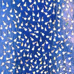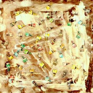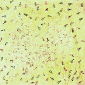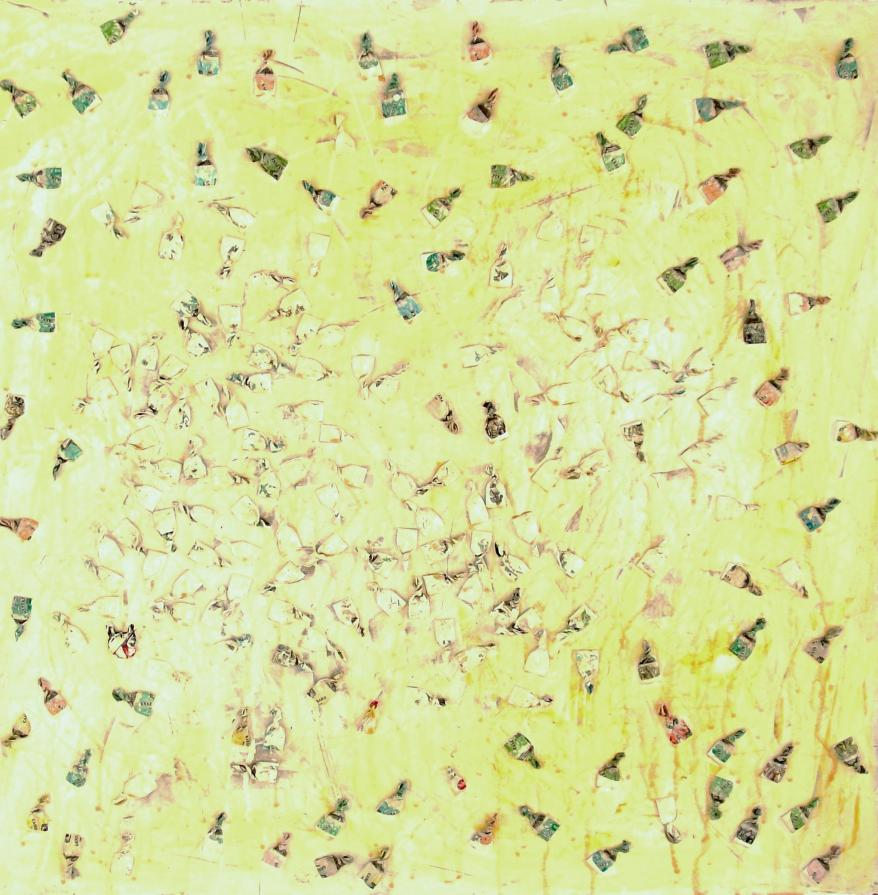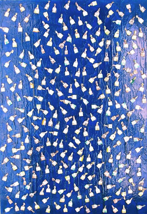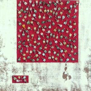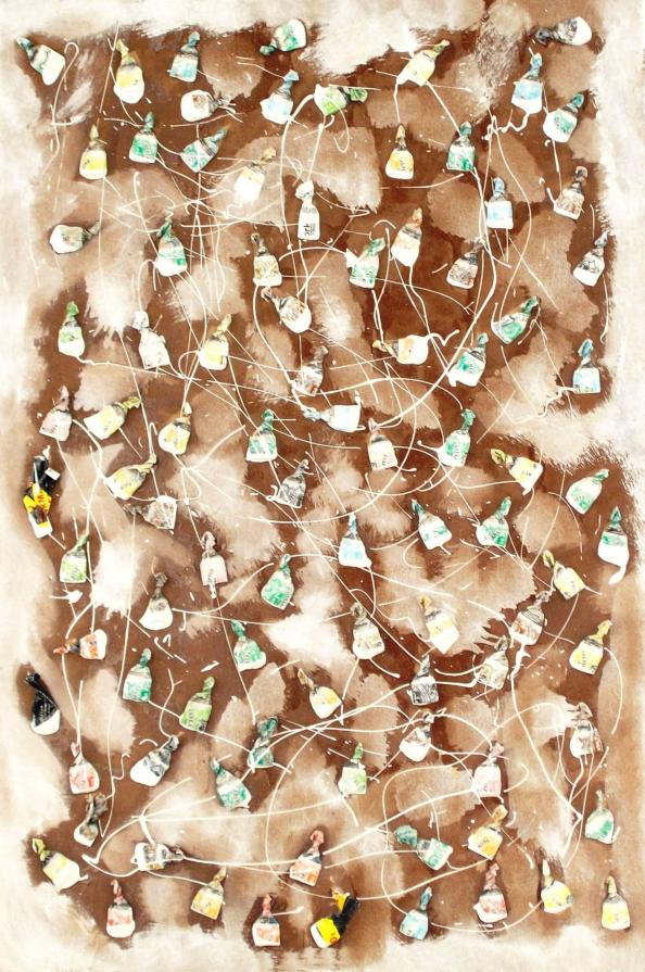 E’ singolare notare come questa recente produttività dell’artista (comunque avvezzo all’utilizzo di materiale di riciclo), sia indissolubilmente correlata alla presenza e alle azioni di questo misterioso personaggio, all’aleatorietà e all’incertezza dei suoi rituali. Che fa quello che fa, indipendentemente dal destino che l’artista ha riservato ai suoi scarti Una silente e misteriosa corrispondenza sembra ormai sottesa tra questi due individui: periodicamente lo Sconosciuto lascia le sue carte e altrettanto periodicamente l’artista le raccoglie per dare vita alle sue realizzazioni.