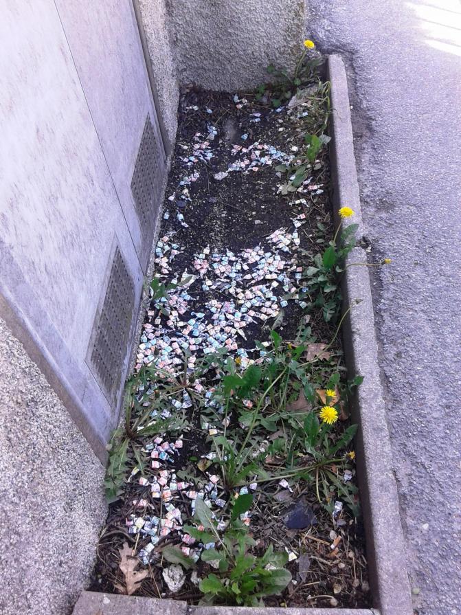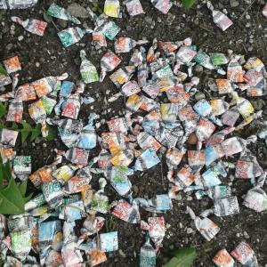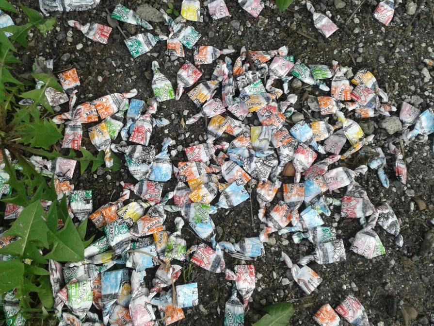 Qualcuno le ha mangiate , ne ha consumato la dolce leccornia e poi ne ha ripiegato ,con perizia e attenzione, l’involucro e lo ha gettato nello stesso luogo ( probabilmente nello stesso orario) e seguendo e reiterando nel tempo uno stesso cerimoniale.