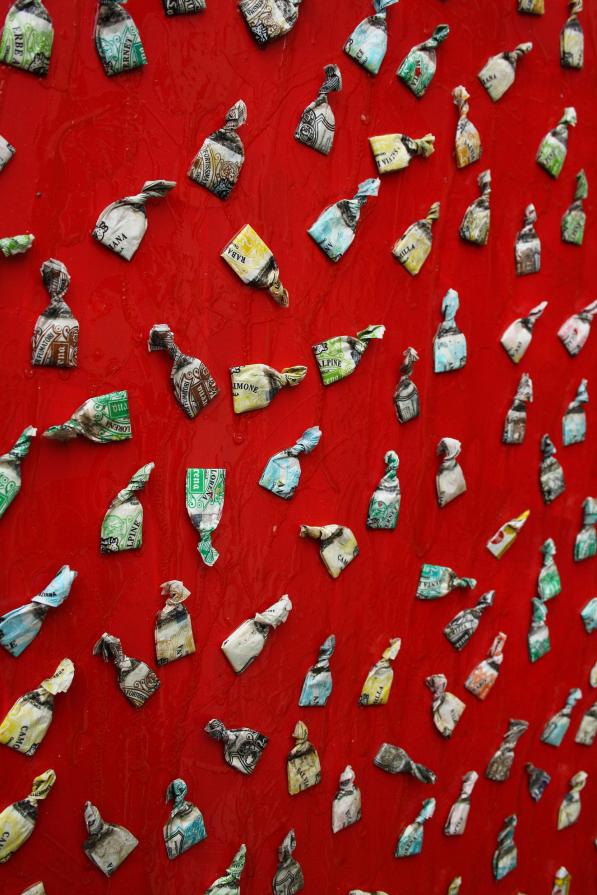 Di primo acchito, e ad una certa distanza d’osservazione, al passante, sembrano delle piastrelline colorate, dei tasselli quadrati, parti di un mosaico, della lunghezza di pochi centimetri e terminanti all’estremità con un’appendice , appena percepibile, a mo’ di ciuffo, talvolta dello stesso colore della base. Ma ad un contatto ravvicinato, tali forme colorate e regolari svelano la propria sembianza di caramelle, pressoché piatte, prive di spessore, che al tatto ne rilevano l’assenza di contenuto.