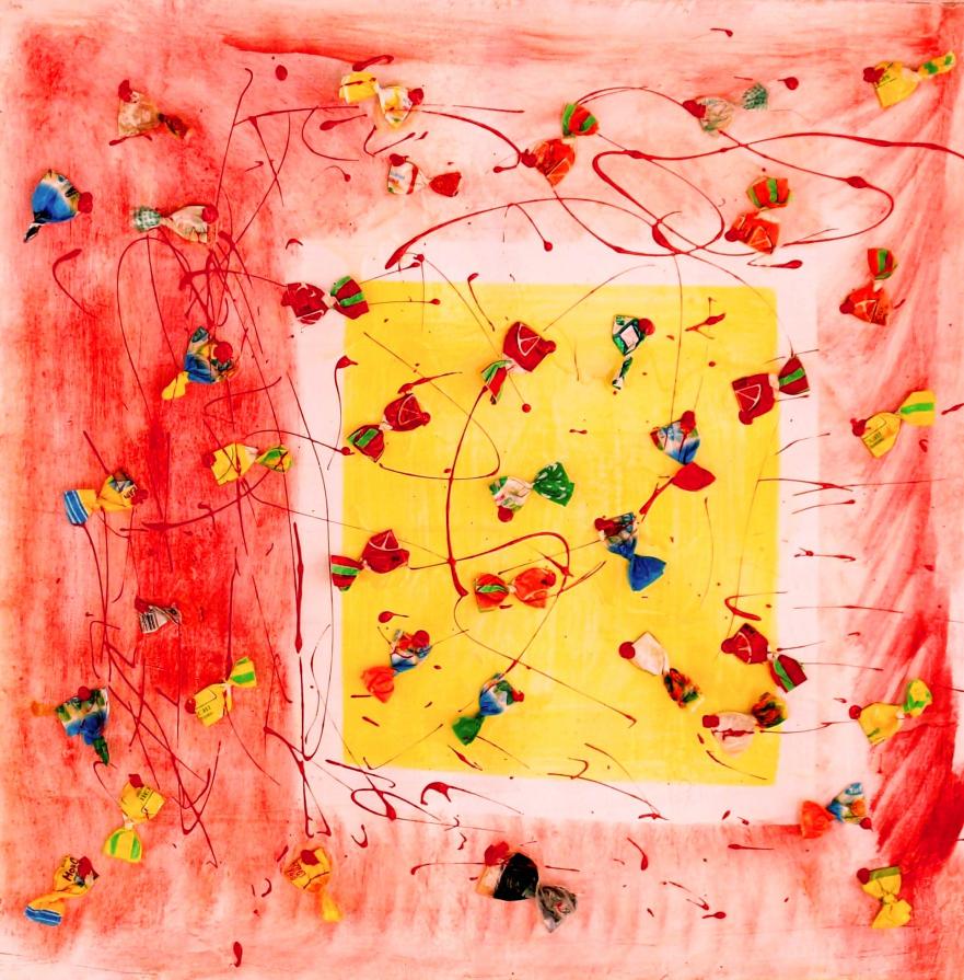 Caramelle da uno sconosciuto . Una storia vera. Circa 6 anni fa , un estate del 2009, mentre facevo jogging, , camminando lungo un percorso ciclabile, ai margini di una strada del paese dove vivo , mi sono imbattuto, con lo sguardo, su un cumulo di quadratini colorati , simili a piccole piastrelle, a tasselli di un mosaico, giacenti in ordine sparso ,in un piccolo fossato . Incuriosito, mi sono chinato per verificarne la natura e la consistenza e, con mia sorpresa, ho realizzato che si trattava di carte di caramelle colorate ripielegate su sé stesse in maniera precisa e meticolosa, da risultare una sorta di quadratino con un appendice finale. Mi avevano colpito per la loro peculiarità estatica, la precisione della forma, la superficie cromatica, uguale e al tempo stessa diversa,che contraddistingueva ciascuna caramella, il cui involucro era ripiegato con sapienza e precisione e poi abbandonata n un rigagnolo stradale. Erano circa una quarantina di carte di caramelle. Poiché ero solito utilizzare materiale di riciclo, proveniente dall’uso comune, nei mie quadri , ho pensato di raccogliere questo materiale originale per utilizzarlo, all’uopo ,nei mie lavori artistici, quando ne avessi avuto l’’ispirazione. L’attrazione verso quelle carteperò fu così viva e immediata che dopo due giorni realizzai il mio primo quadro dedicato ad esse , dalle piccole dimensioni e dalla superficie rosso cromata. Dopo un paio di settimane sono ripassato dallo stesso luogo è con mia sorpresa ho rinvenuto ancora un numero maggiore di carte di caramelle,lasciate nello stesso luogo ripiegate nella stessa maniera di quelle rinvenute precedentemente. Erano lo stesso tipo di caramelle, la stessa tipologia di colori associata a diversi gusti prodotti dalla medesima azienda dolciaria Anche questa volta le ho raccolte con l’intento preciso di farne subito un altro quadro . E così, periodicamente. da allora. passo da quel luogo per rinvenire e recuperare quelle carte che qualcuno ripone allo stesso modo e nello stesso luogo in modo continuativo e ripetitivo. Ormai sono anni che questo rito si consuma con le stesse modalità. Da una parte lo sconosciuto mangia le stesse caramelle , le ripiega e le getta in quel selciato, edl’artista che periodicamente, ripassa dallo stesso luogo per recuperare quelli iscarti che diventano materiale artistico costituivo dei suoi lavori.
