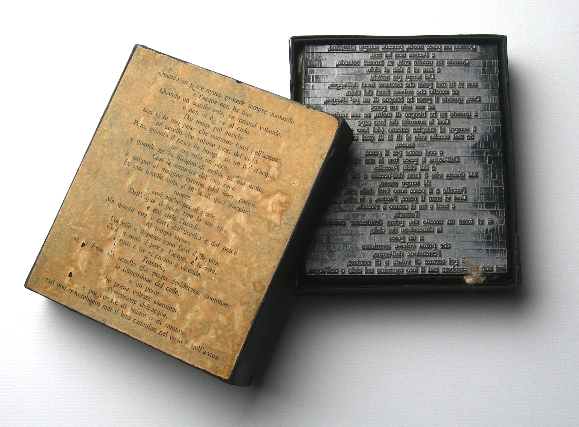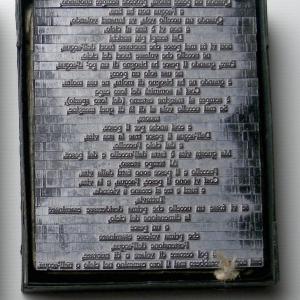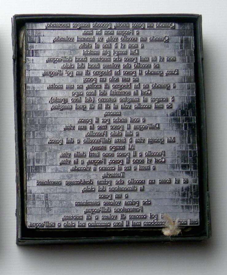 Piombo (particolare) Piombo Installazione, Memoria, 11x3x13cm Scatola di cartone, righe tipografiche, bozza di stampa - 1978 Inserita 8 anni fa 2 Mi piace Non piace più 0 Commenti 72 Visite Condividi Facebook Twitter Google + Piace a 1 Tanya Bartolini Premium Artista - Milano Commenti 0 Inserisci commento E' necessario effettuare il login o iscriversi per inserire il commento Login