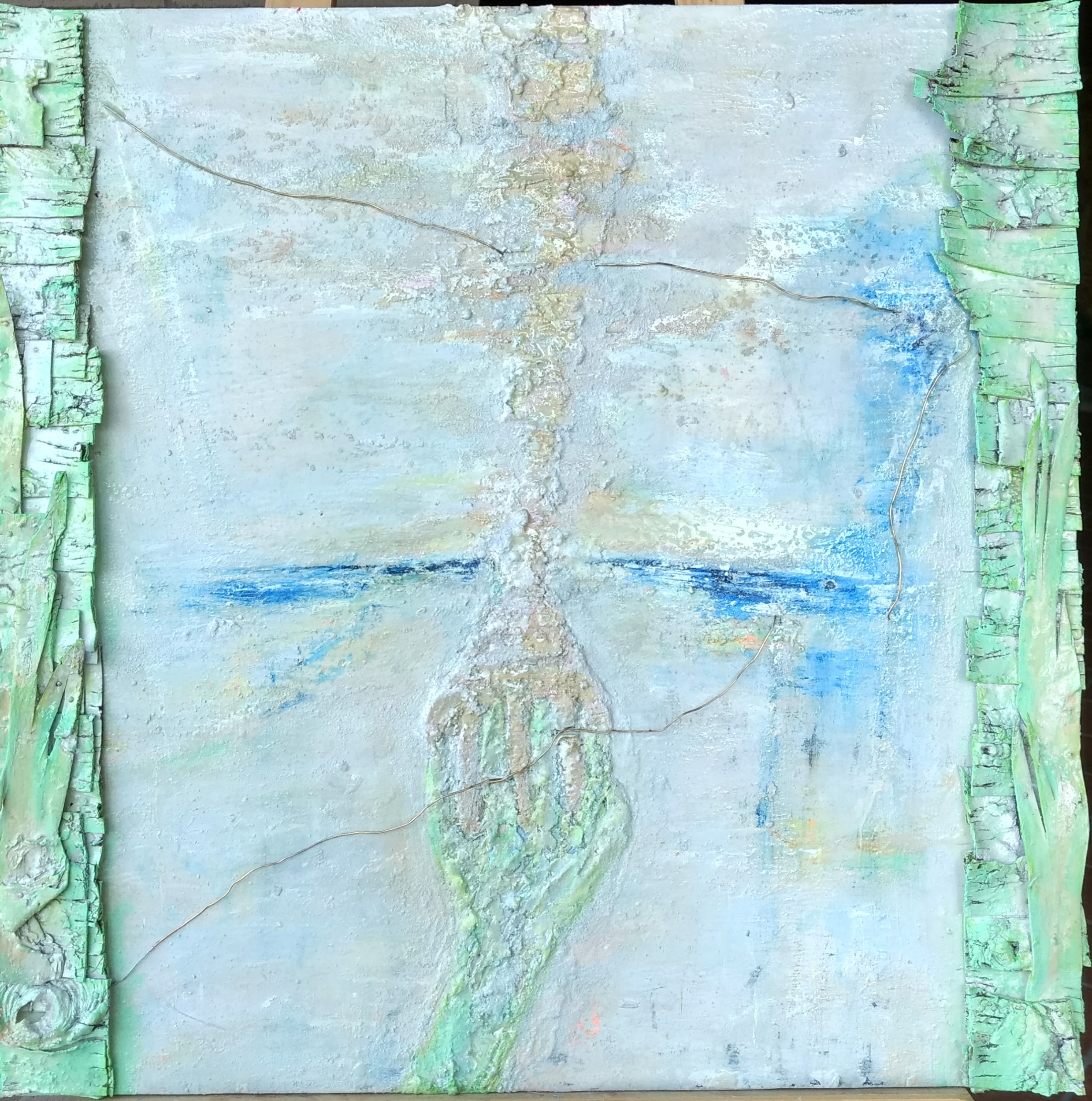 tecnica mista materica : stucchi plastici, smalti , acrilici, metallo, corteccia riportata, resine, su supporto ligneo