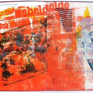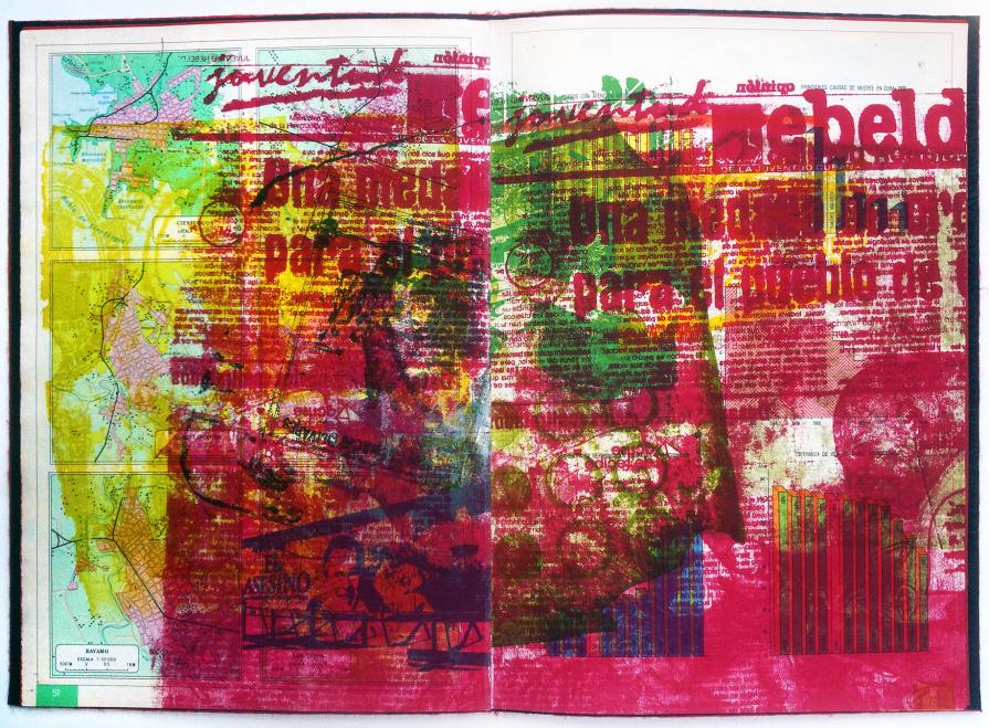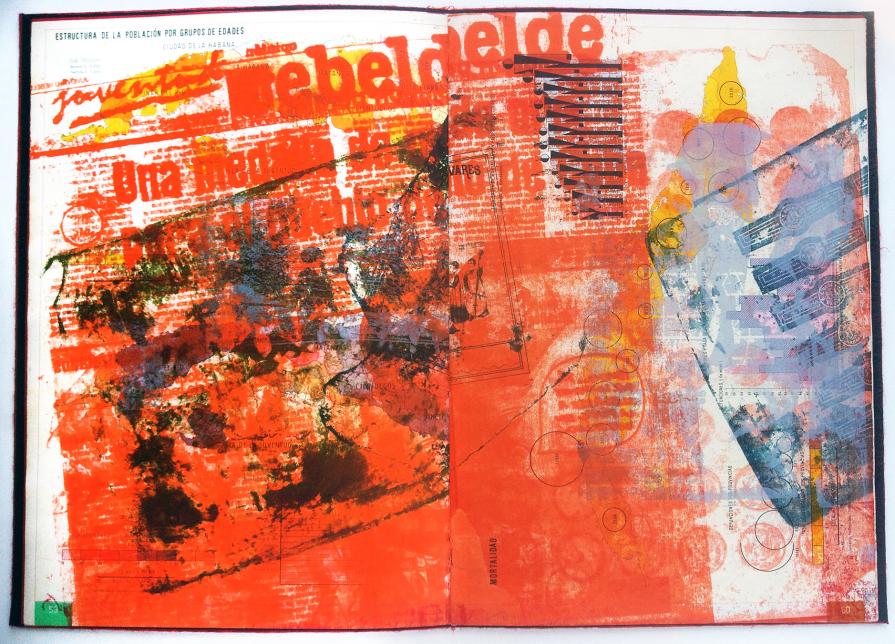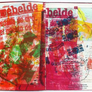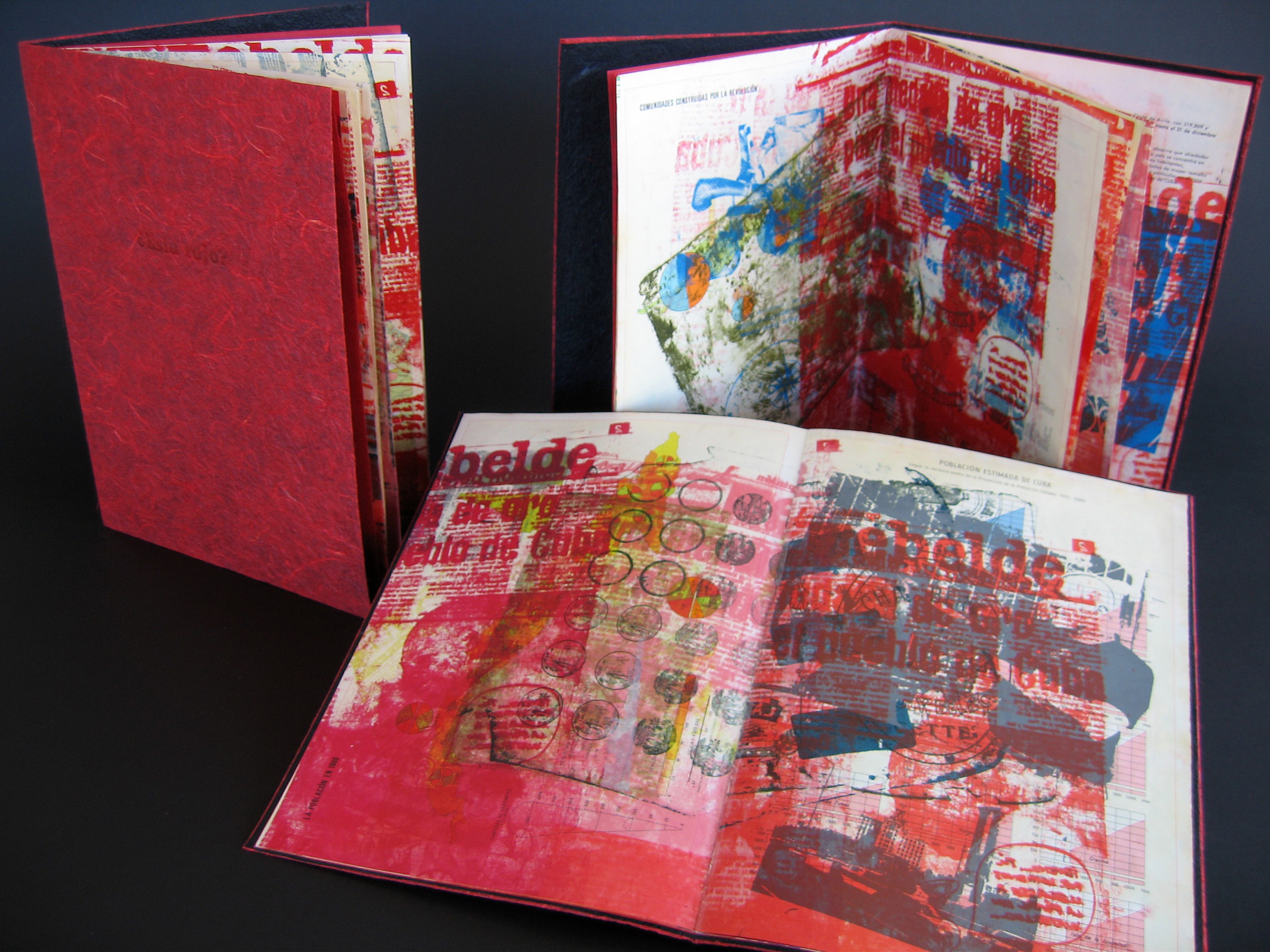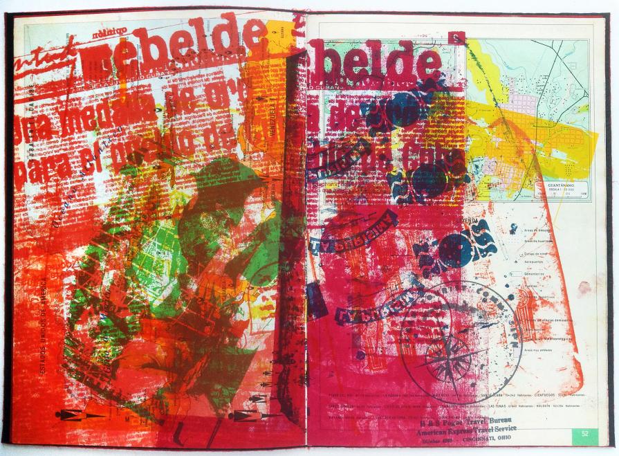 ?ESTA ROJO? is a collaged printing of found historical images and current images from newspapers in the spring of 2006 onto 1980's Cuban geography text.