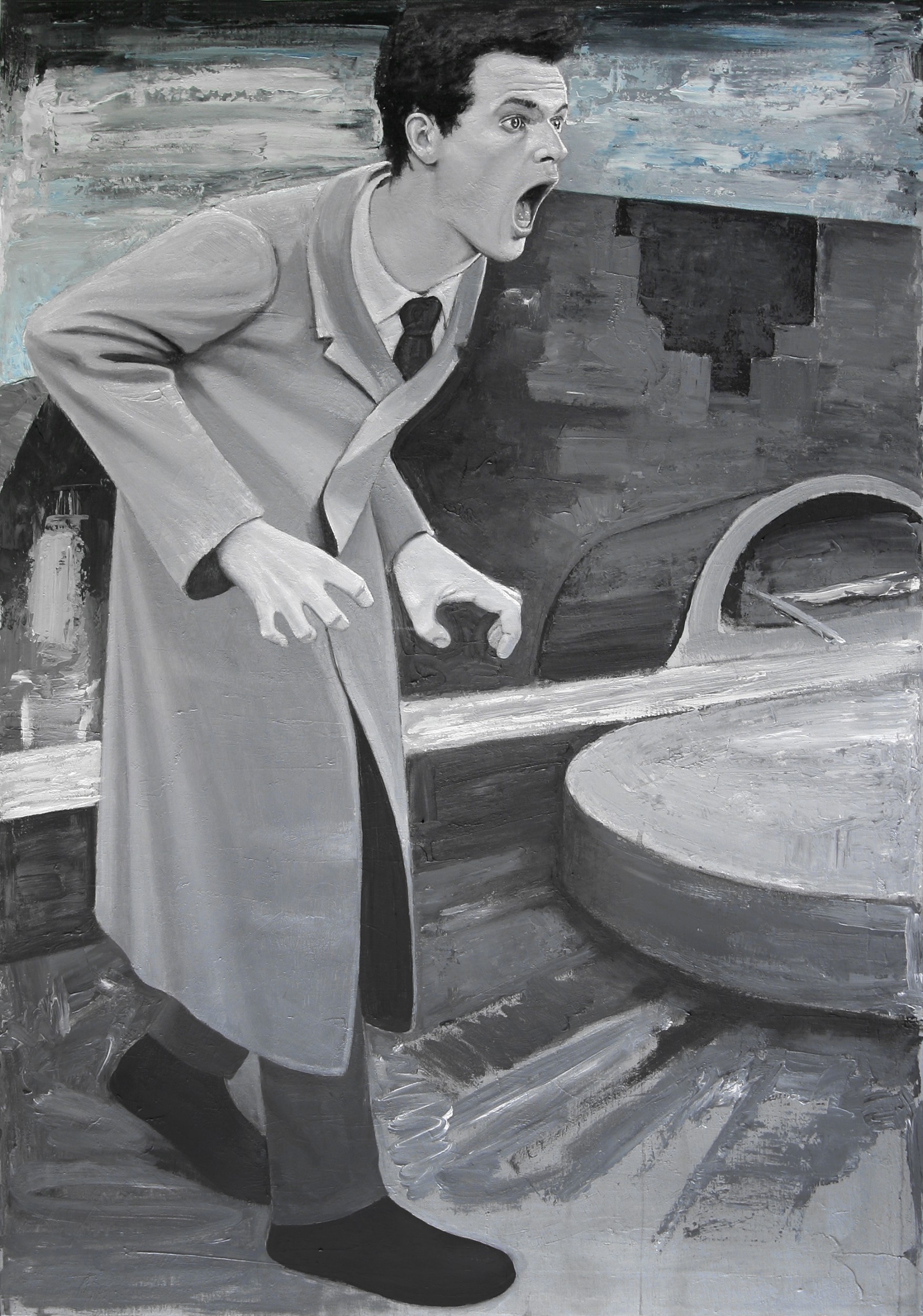 'The Mouse Does Not Dance' fa parte di un ciclo di opere iniziato nel 2017. Fondamentalmente mi interessano le dinamiche alla base del comportamento umano: inclinazioni, ruoli, identità. Viviamo in uno stato di perpetua dipendenza, in precario equilibrio tra follia ed incertezza. Spesso focalizzo la mia attenzione sulla persistente condizione di vuoto esistenziale, per poi congelarla all’interno della pittura.