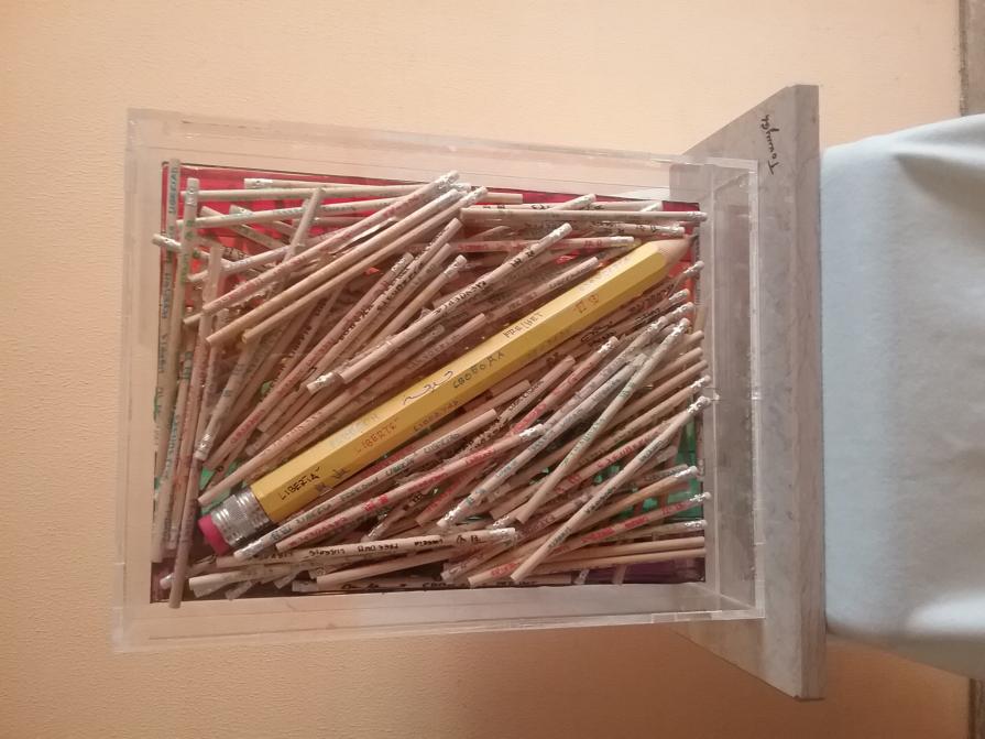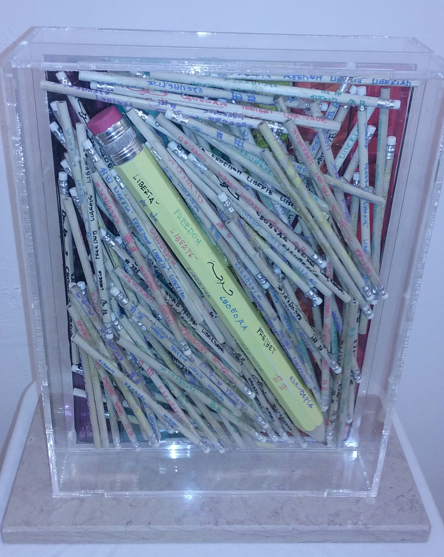 La libertà di dipingere, di installare, disegnare, scrivere esprimendola la libertà di ogni genere di tabù. In memoria degli otto artisti di Charlie Hebdo uccisi a Parigi 07/01/2015 . Ogni matita è scritta in 11 lingue in diversi colori in acrilico con la parola libertà racchiusi in una teca di plexiglass e con la base di marmo di Trani. Le matite sono duecento più una grossa matita. La scultura è stata selezionata da diverse gallerie, la prima biennale di Bari 2016 e la triennale di Roma 2017. Artista Vitale Tommaso Maurizio-Bari (tommy64) . www.tommasovitale.jimdo.com.