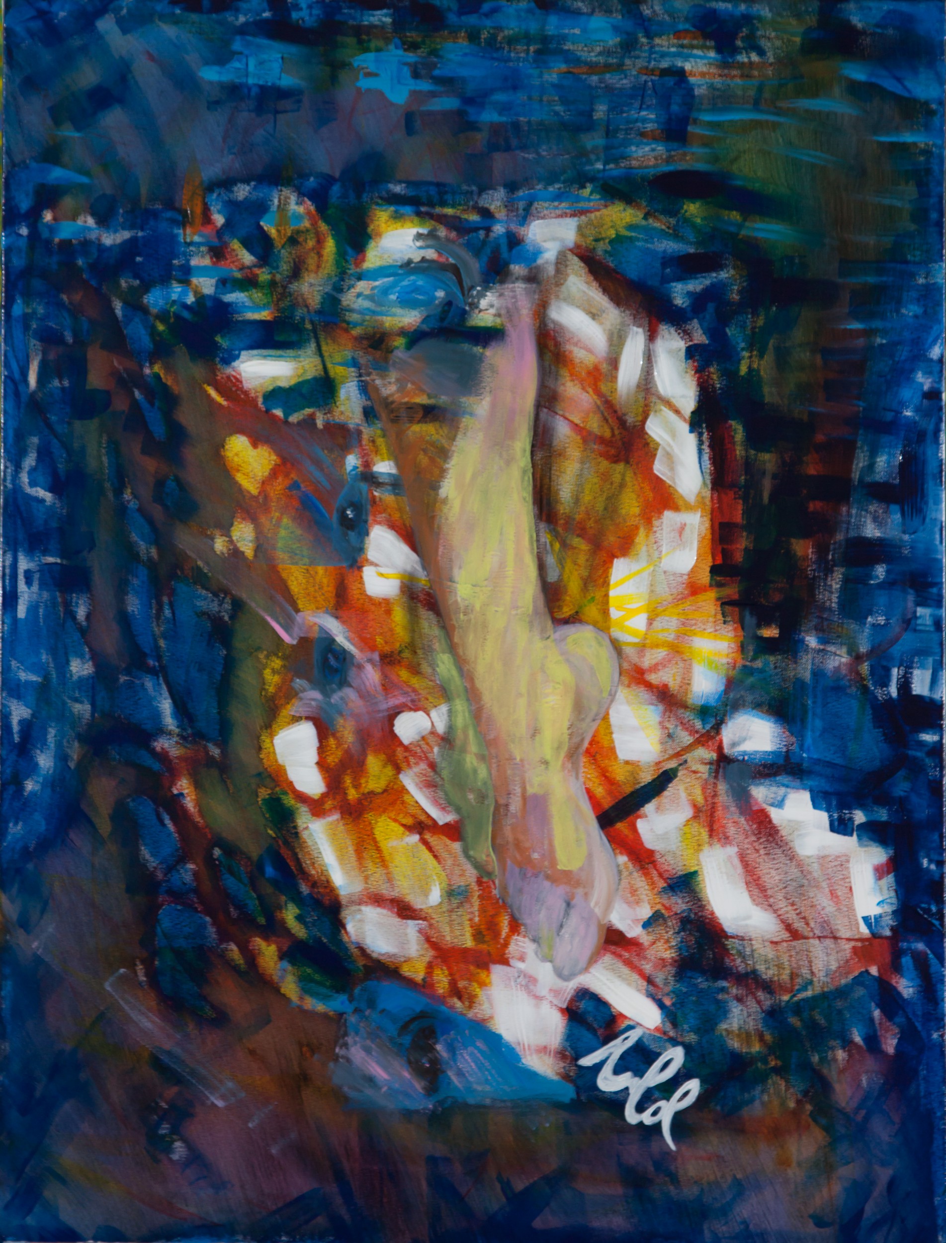 Il piede dell’artista medesima che campeggia al centro della scena; il palcoscenico di colore blu si apre con pennellate di bianco, giallo e arancio conferendo materia alla luce e allo spazio in cui il piede padroneggia la tela, quale protagonista unico ed assoluto. Attore isolato, ma autonomo, concluso nella sua forma ritrae la sinuosità e la tenerezza di un corpo nascosto e lasciato all’immaginazione dell’osservatore. E’ un piede elegante, affusolato, vicino all’iconografia greca, che diventa spunto per omaggiare i frammenti classici. La compostezza dell’immagine solitaria, racchiusa in un cerchio di luce delineato da pennellate di blu verticali ed orizzontali, riflette un desiderio atavico di antichità. Il movimento evoca uno slancio che viene accennato con pudore nella elevazione quasi come fosse un passo di danza, apparendo in tal modo, cosciente di un nuovo viaggio e al contempo, refrattario ad una nuova avventura; tuttavia, proteso alla riscrittura del mito che prende forma tra le sfumature di colori incipriati che lo raffigurano delicato ed allegorico, la cui leggerezza rievoca i piedi delle Muse di Botticelli.