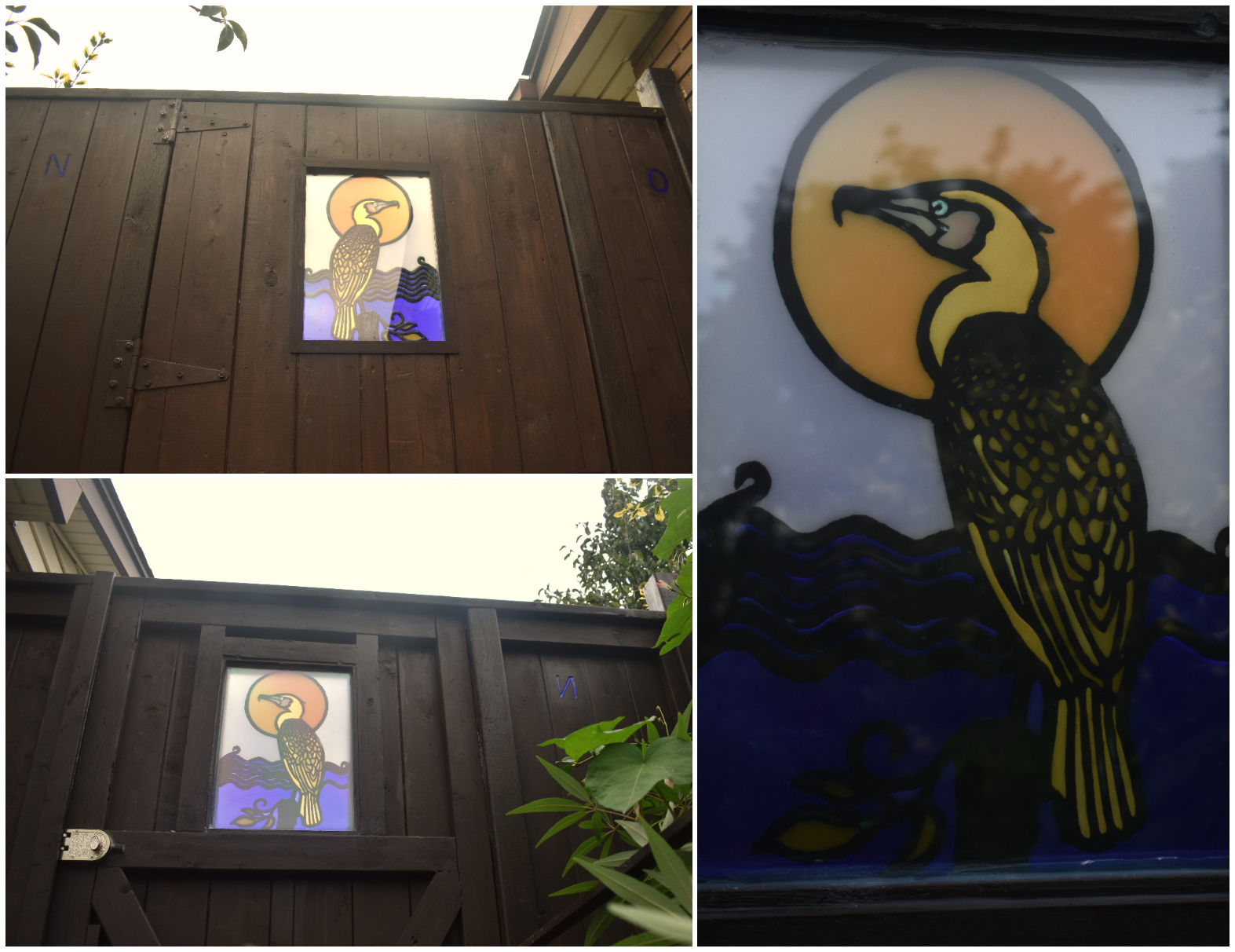 Symbols for atmospheric gasses nitrogen (N) and oxygen (O) flank the cormorant on the front (upper left). Although on the reverse side (lower left) the O symbol is invariant in the mirror plane, the N becomes Cyrillic И, corresponding to the person the gate is dedicated to.
