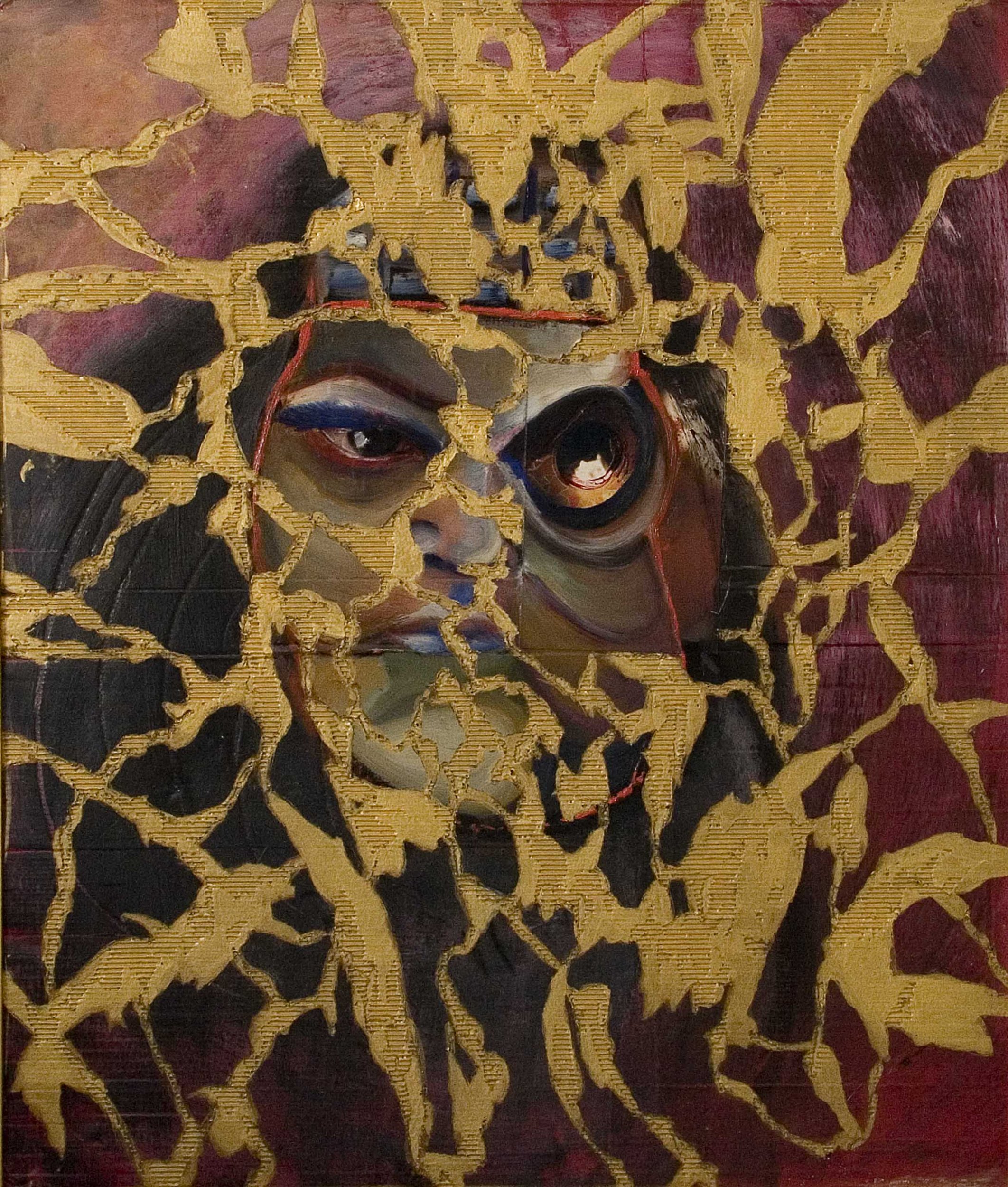 l'opera rappresenta una donna sfigurata dopo lo sfortunato incontro con una bomba inteligente,lo sfondo oro simboleggia lo stato da martire e l'esplosione violeta, la tecnica usata è mista olio, pastelli, collage fotografia, le quali sapientamnte unite creano una sensazione di infinita compassione e rabbia