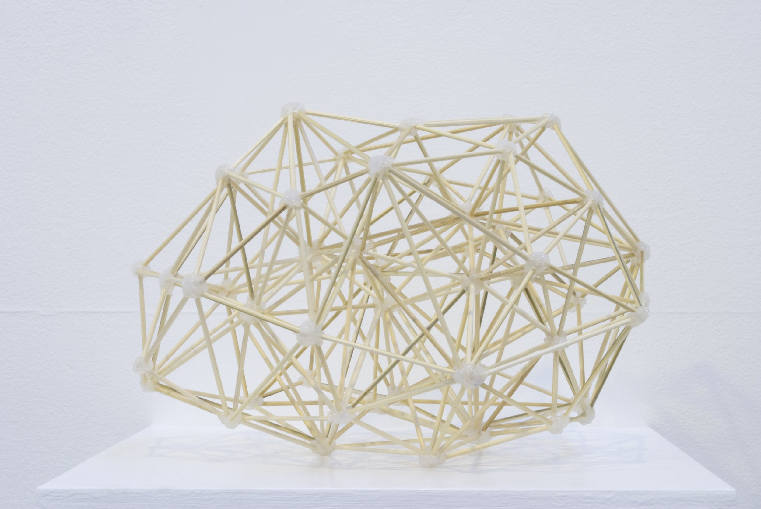 Sculpture made of wooden sticks and glue. The sticks are cut in random lengths and put together in tetrahedrons, triangular pyramids. In this way the structure is building outwards in an organic way based on randomness.