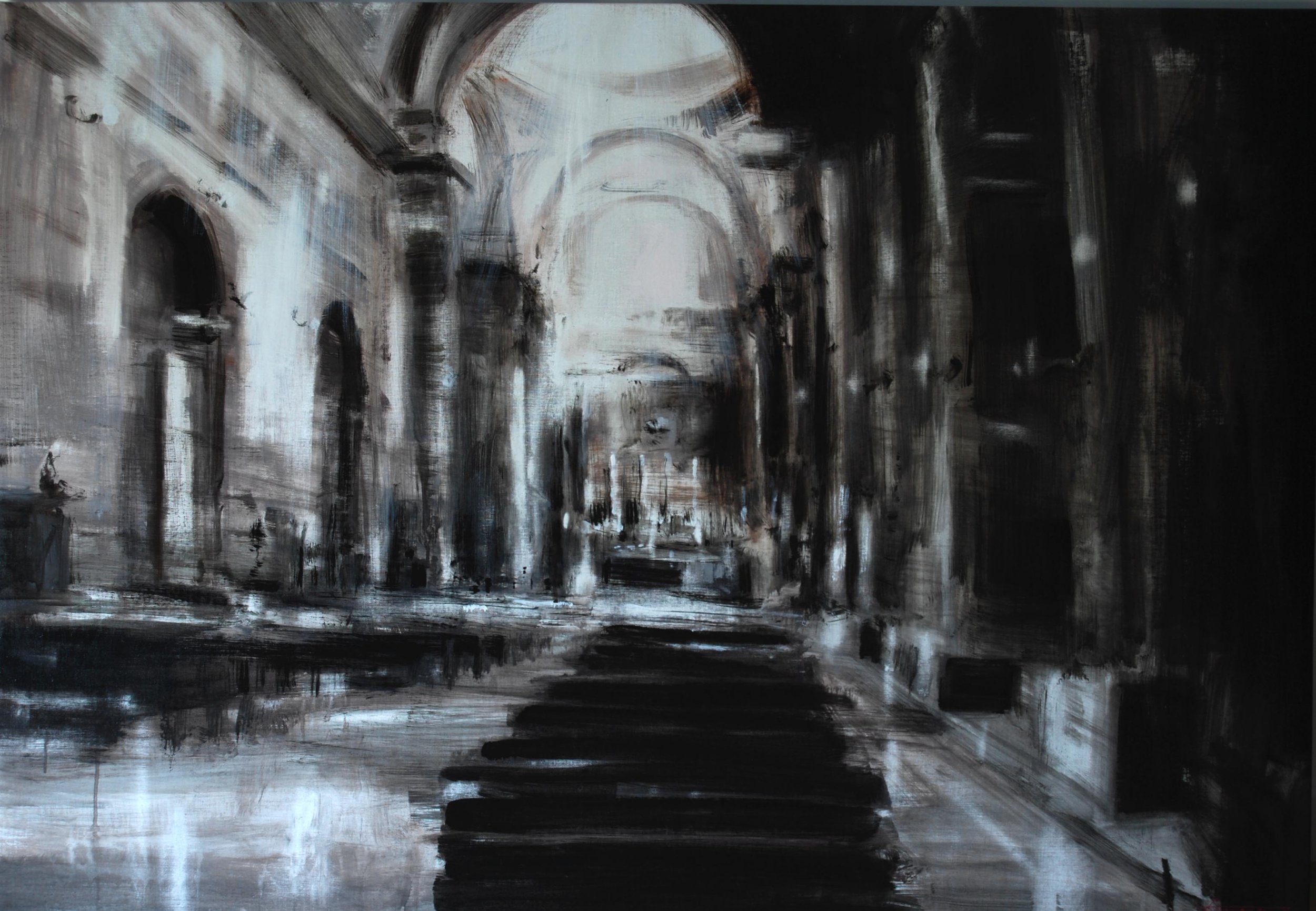 VUOTO. Un titolo, un percorso… Una minaccia o un ragguaglio. Un consiglio, un avvertimento inascoltato. Se fosse musica sarebbe un assolo basso di piano. Ma è colore. Resti di un tessuto crespo fatto di fibre ordite per filtrare la luce. A volte roca, altre, altissima nota. Variazione improvvisa e affascinante. La mia ultima opera nasce dall’incaglio di una luce nello spazio sacro. Piove luce dentro l’interno sacro così come solvente sul colore. Potrebbe sembrar pieno invece svuota le forme e lo spazio è violato dal cono luminoso. Sacro e profano uniti nel rituale pagano del fare pittura. Forma e contenuto, stilemi classici della mia pittura che si riconoscono come traccia del mio passare, del mio passato.