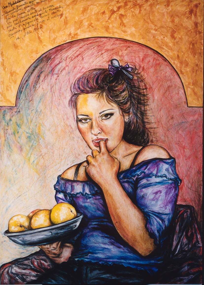 E' il primo dei tre sulla età della donna e le sue stagioni emozionali. Questa rappresentata è l'adolescenza. In ognuno c'è un elemento metaforico (qui il cucchiaino)e le poesie di Alda Merini scritte in alto sulla tela che meglio rappresentano il mio stato d'animo da donna ferita dalla vita che riemerge più forte di prima. La rosarossa(io) si apre con passione alchemica e struggimento vitale... la VITA/MORTE coesistono implacabili e l'eros è determinante poesia del divenire... messaggio extreme di una donna che vive le emozioni ai limiti dell'umano possibile e i suoi quadri altro non sono che un viaggio fantastico dentro la sua mente e il corpo violato dall'insensibilità altrui e da giochi di potere che nulla hanno a che fare con l'arte pura e disinteressata.