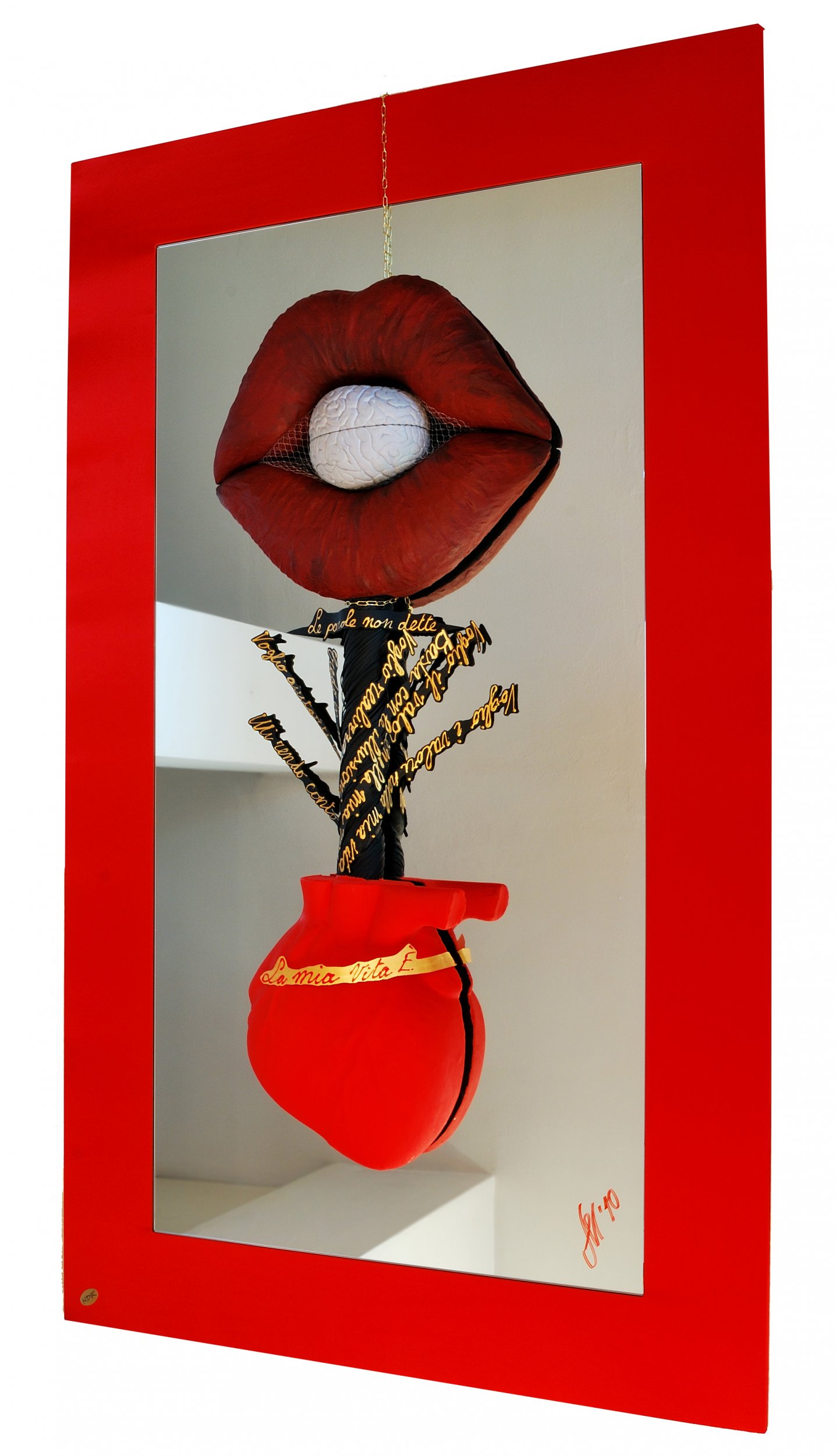 Le Parole Non Dette Installazione, Politico/Sociale, Politico/Sociale, Minimal, Materiali vari, 100x170x15cm Altri metalli Materiali vari Rosso Oro morte controllo cuore bocca frasi spontaneità testo grafica sostituzione specchi La mente, controlla la bocca: il giudizio e il pregiudizio fa sì che le parole/spontaneità che il cuore dice, diventino parole morte e soffocate e la bocca dice solo ipocrisie o parole mediate...nulla di spontaneo. Installazione, Scultura & Performance (Premio Celeste 2010) Inserita 15 anni fa 6 Mi piace Non piace più 6 Commenti 306 Visite Condividi Facebook Twitter Google + Piace a 5 Daniele Gori Artista - Ravenna Fabio Modica Artista, Pittore - Catania Leo Zaff Artista - Venezia Renato Zacchia Artista - New York City, Stati Uniti Pigi Artista - Roma Commenti 5 15 anni fa ANA SEKACH Artista, Pittore Molto estravagante, complimenti! in bocca lupo! 15 anni fa Masri - NEUTRAL-ISM Artista complimenti molto bella. 15 anni fa Pigi Artista Bel lavoro, anche se il senso "la bocca dice solo ipocrisie" mi risulta eccessivo.. comunque complimenti!! 15 anni fa SER Artista Ti ringrazio,e contraccambio, mi piacciono molto i tuo lavori fotografici "Vibrazioni". Complimenti 15 anni fa Carlo D'Orta Artista Bella, molto brava Inserisci commento E' necessario effettuare il login o iscriversi per inserire il commento Login