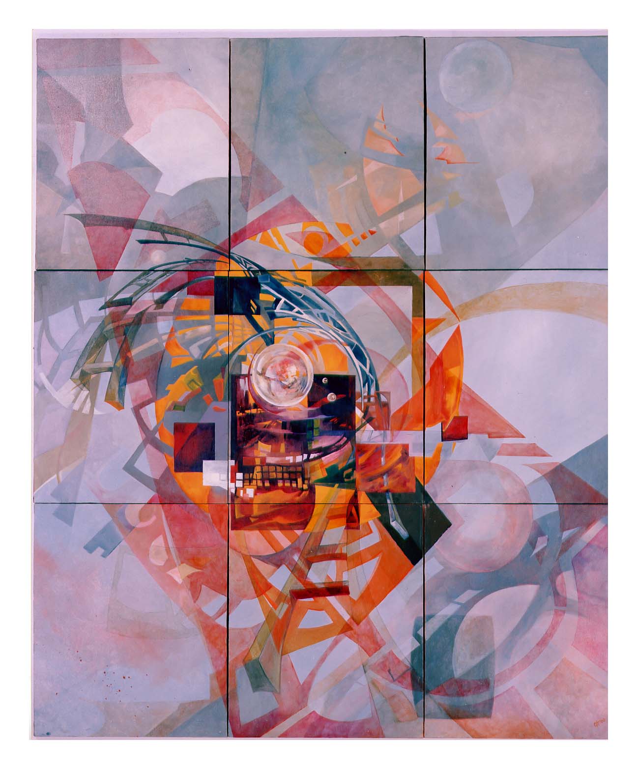n. 9 tele ad olio formalmente indipendenti ricomposte in una struttura unica. L'Opera viene intesa come identità psicofisiologica che soltanto per mezzo dell'azione sinstetica delle sue singole parti si organizza in una struttura complessa in costante espansione.