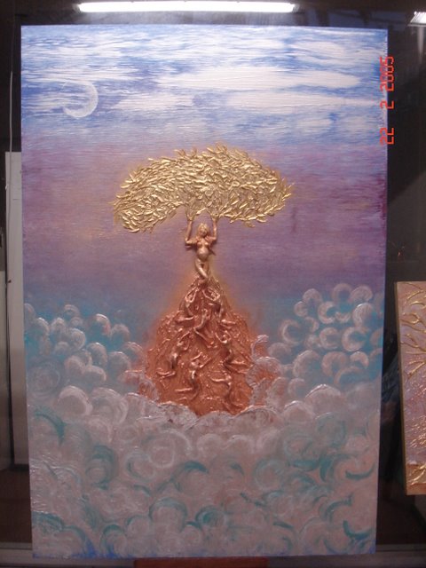 figura di donna incinta in rilievo che sorregge un albero dorato con figure umane in basso che scalano la montagna della vita e una montagna sospesa su nuvole