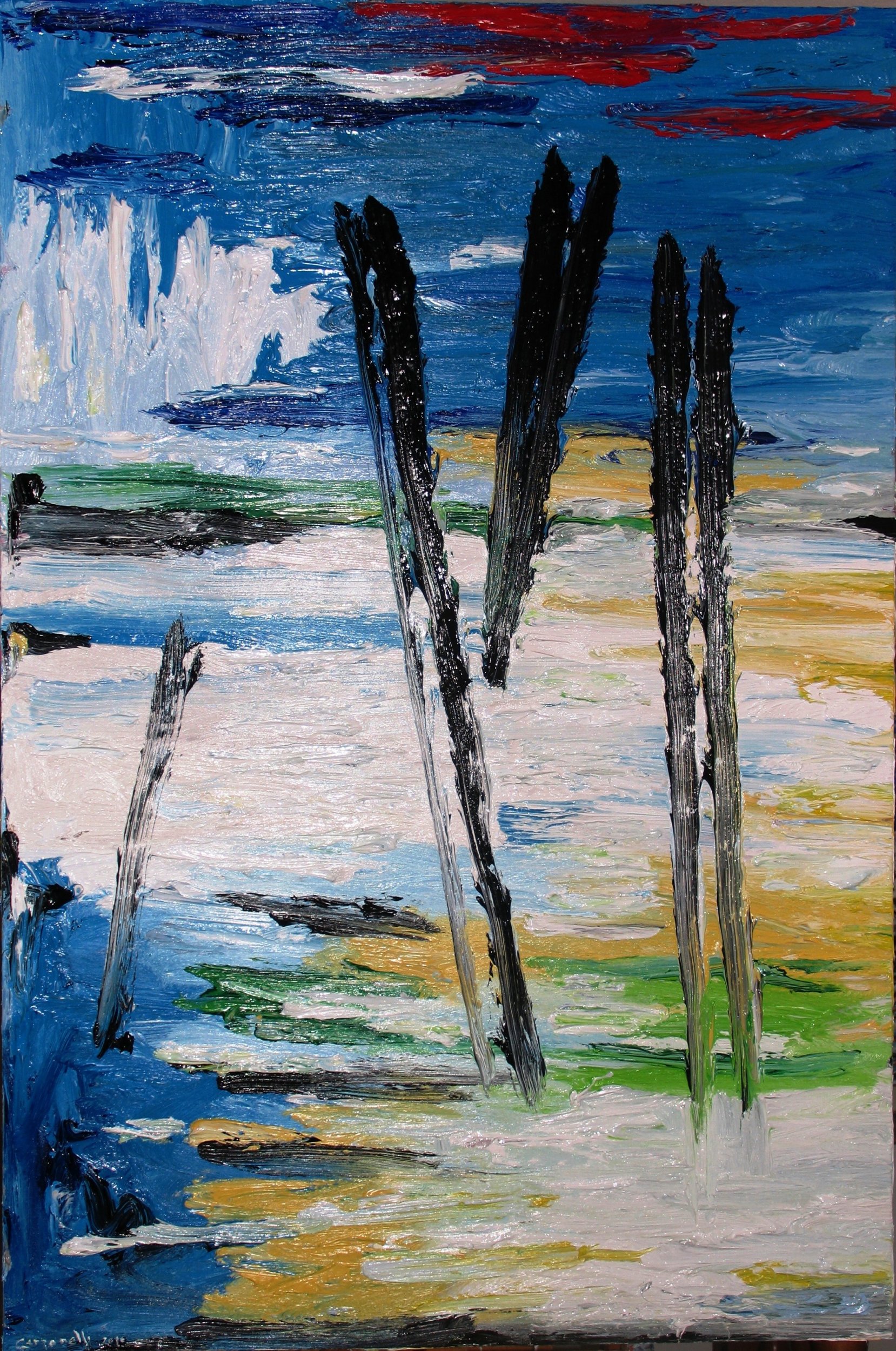 Dal vero l'immersione nel blu è totale,il bianco ti cattura da lontano,l'imponenza della tela ti obbliga ad una distanza riverente, il profumo del colore ti attira, la pennellata materica ed istintiva ti invita a sbirciare tra i solchi e i riccioli in controluce...Insomma, grande fascino.
