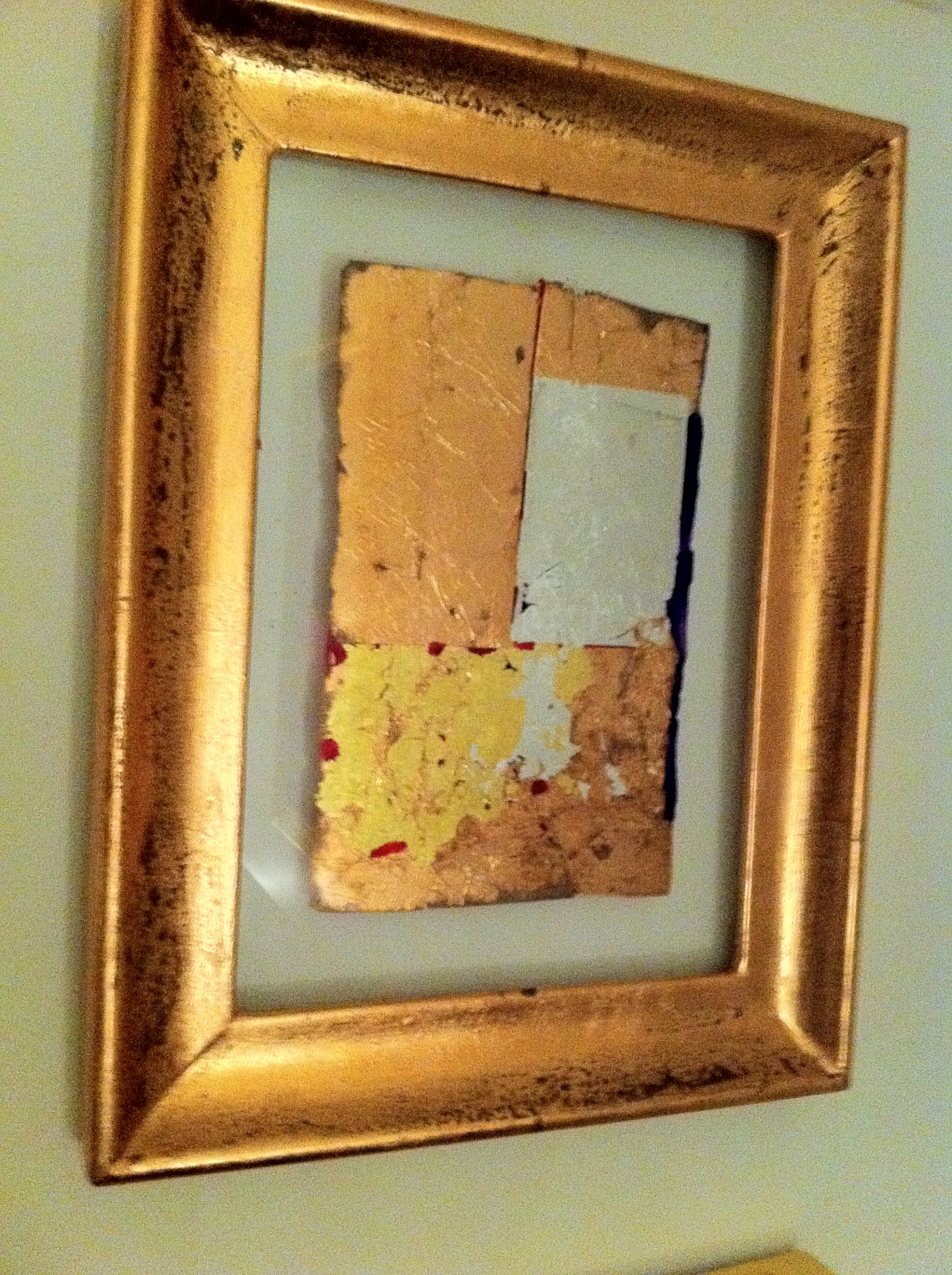Tecnica mista doratura con fogli in rame,argento e oro su vetro e doratura della cornice in oro, graffiato e ossidato al naturale, con linee in colore blue e rosso.
