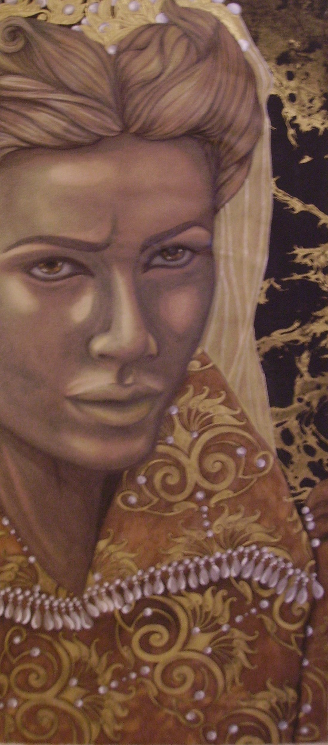 Norma_Sposa Rinascimentale come le altre opere della serie "Oro" rappresenta un momento sospeso, un respiro interrotto, una parola pensata ma non pronunciata, in questo caso attraverso un volto di donna in costume rinascimentale rivisitato.