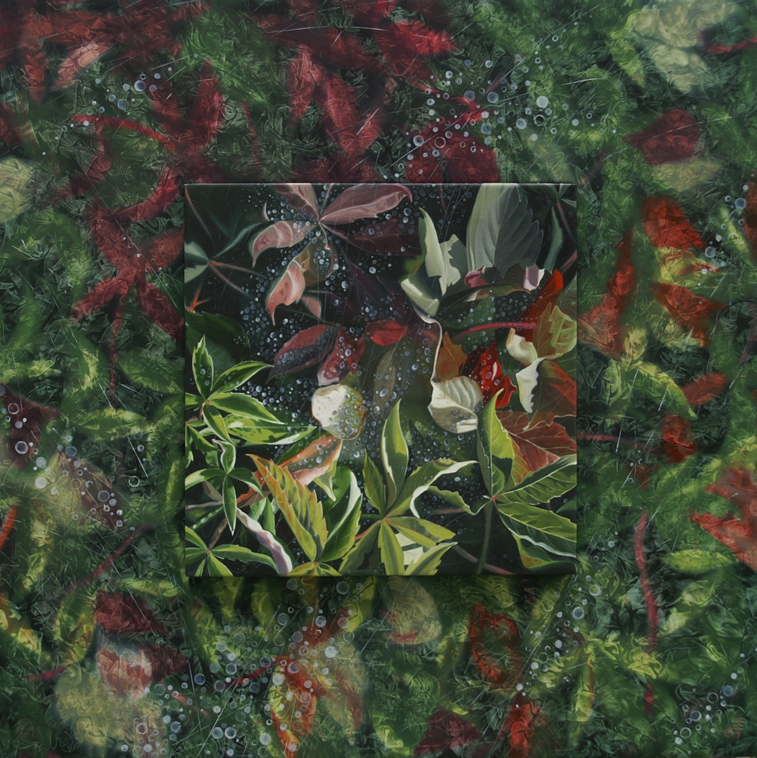 Due tele, una affiora dall'altra. Intorno al nucleo col pattern originale si espande l'interpretazione pittorica che origina un nuovo pattern. Punto di arrivo: il luogo dove il pattern interferisce con la materia del soggetto.