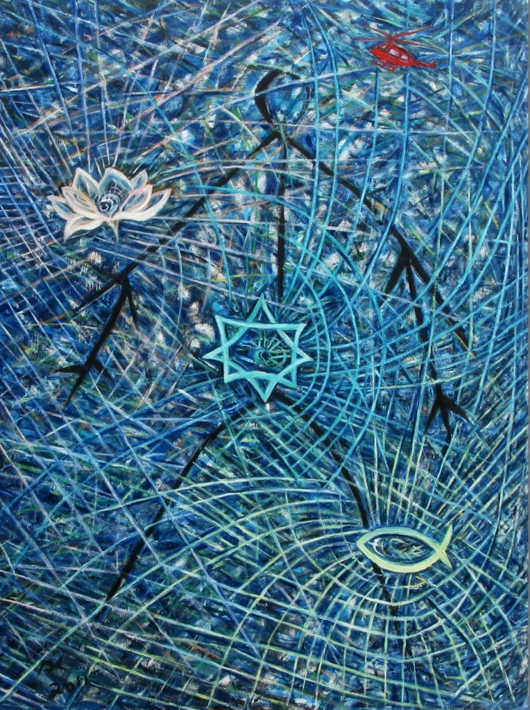 When the water lily, star, and fish get together with harmony, we will be able to look toward world peace. The symbols of Buddhism, Islam, and Christianity themselves are the manifesto of love.