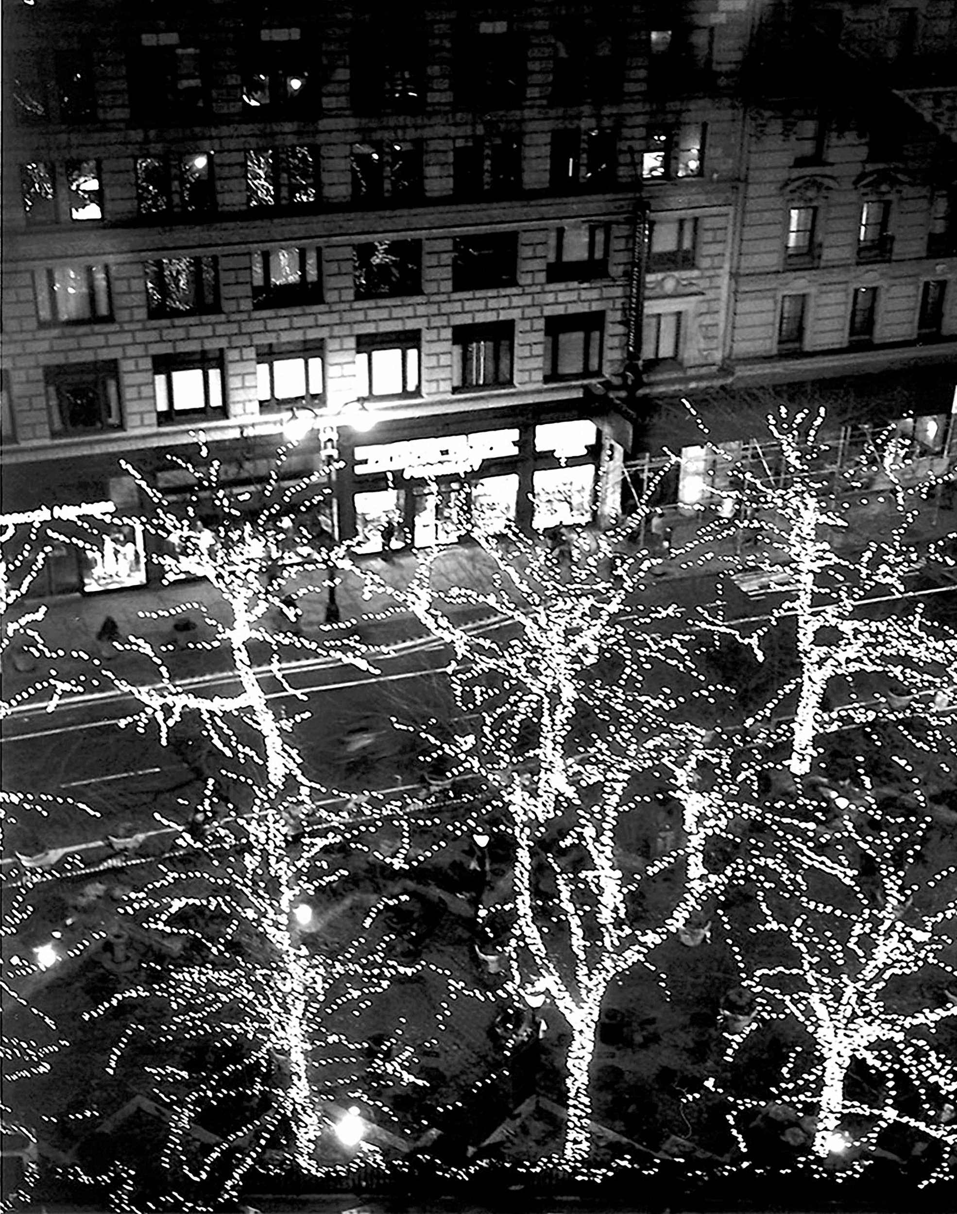 It was only a few days before Christmas on 33rd Street & Herald Square and the trees below me were decked out with strings of electric pearls. The atmosphere was truly festive. I felt like the trees were so happy that they all decided to dance.