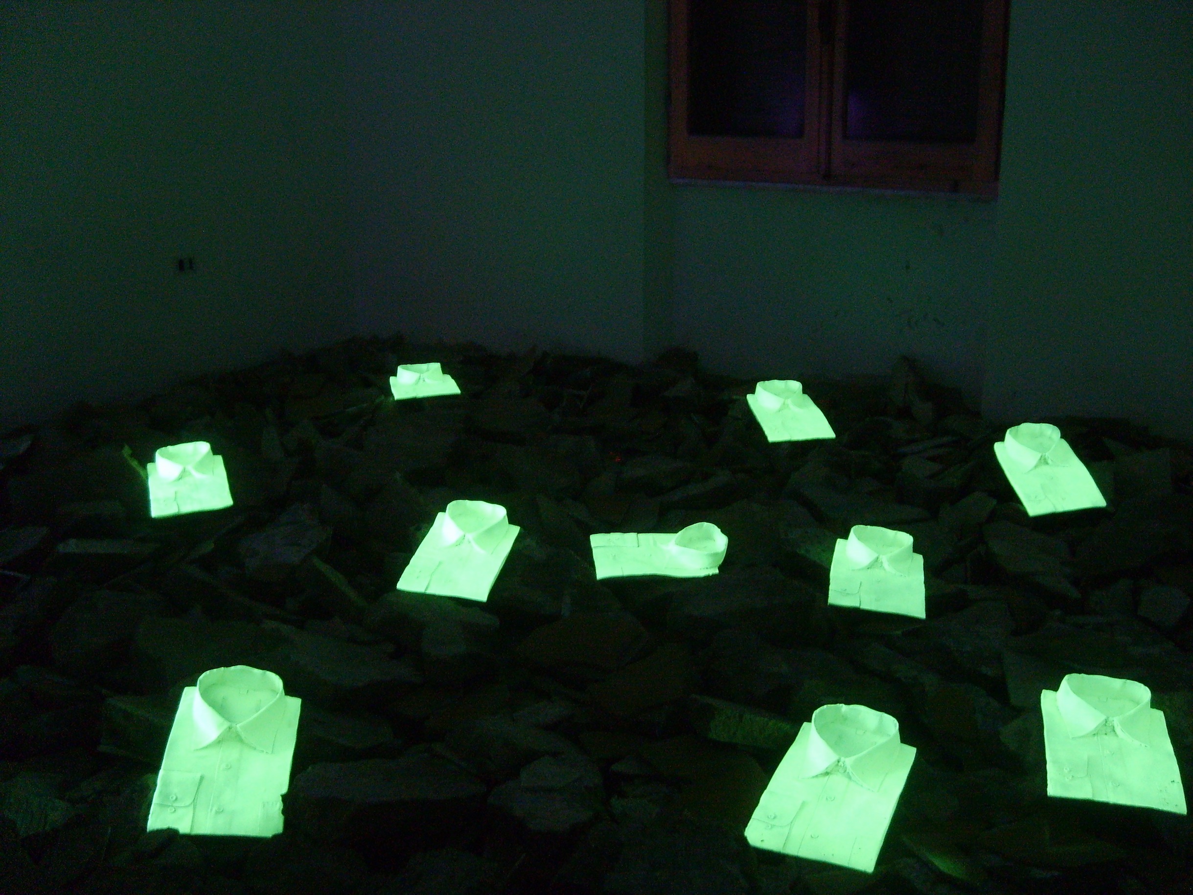 In una stanza con delle macerie ho installato 12 sculture a forma di camicia ben piegata, ha seguito di un bombardamento con armi al fosforo bianco da parte degli americani sulla città di falluja, la popolazione è stata arsa viva lasciando gli abiti intatti.