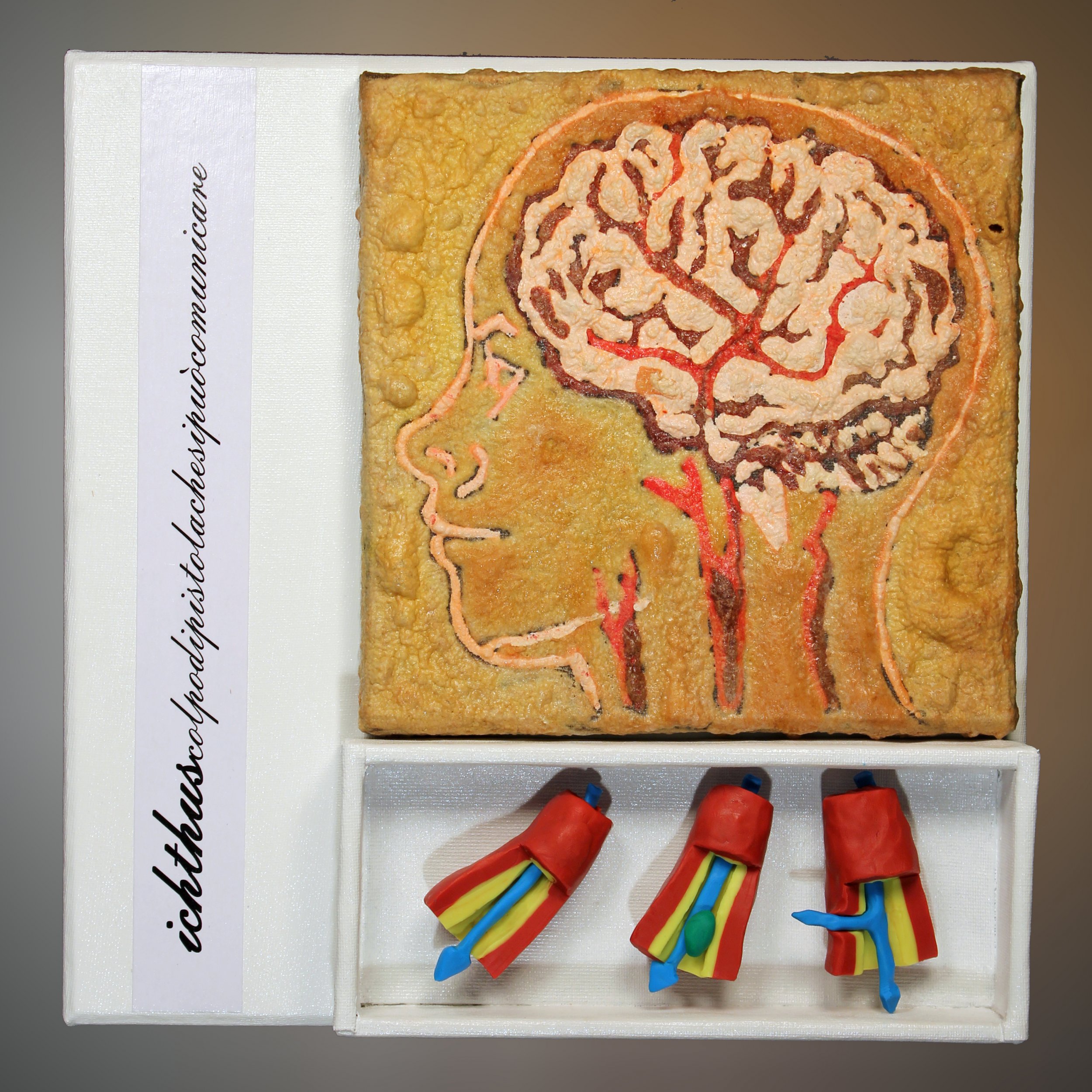 "ICHTHUS colpo di pistola che si può comunicare"2011, pastella all'uovo su tela di lino fritta cm 20x20x1,5 plastilina colorata e legno intelato 30x30x04