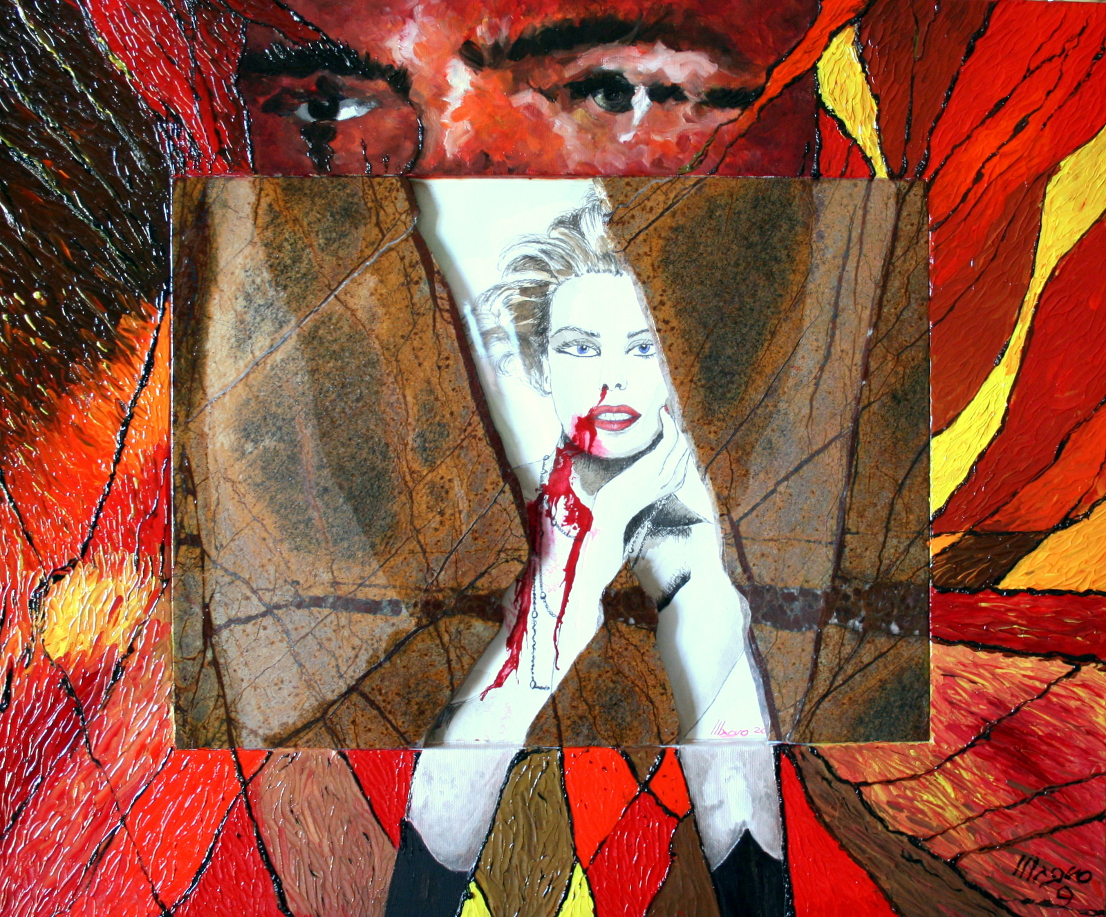 In centro inserto in pietra Forrest brown; il tutto realizzato ad olio su tela con tecnica a spatola.