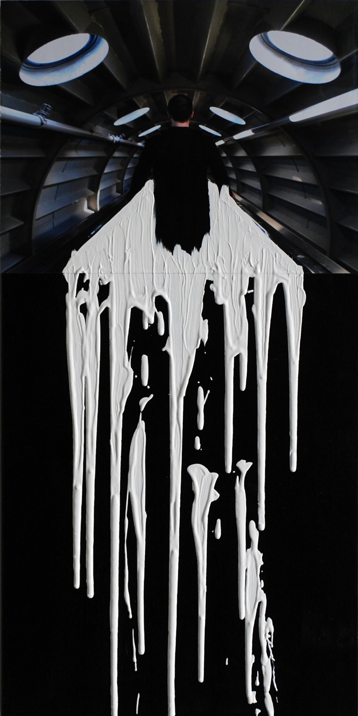 L’uomo di fronte ad un futuro incerto viene colto da uno stato di ansia apparente dal quale invece di scappare, decide di farsi trasportare come su una scala mobile, dove rimane passivo allo scorrere del tempo, osservatore del suo destino. Rimane bloccato a tal punto di perdere credibilità e diventare un’incognita per se stesso. L’uomo si smaterializza, si scioglie, è materia non materia.