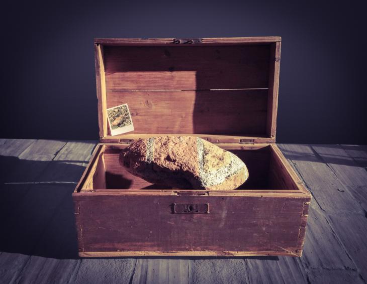 boxed piece of wall, weathered and eroded by river Nure, and a photo