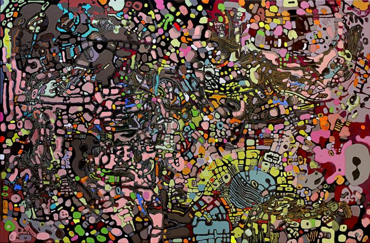 Organic forms of green, blue, orange and pink arranged on a brown structure.