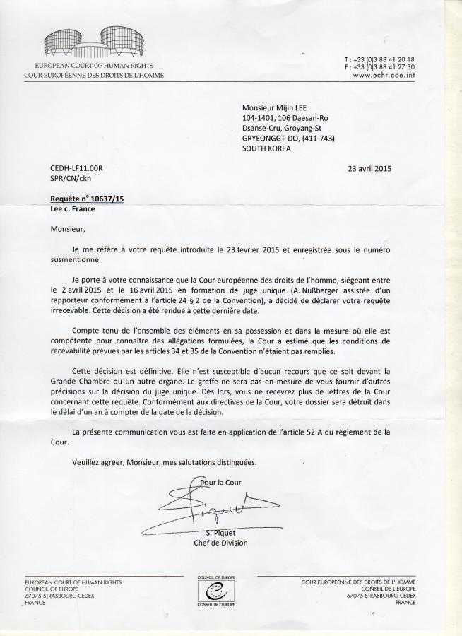 I stayed in Paris two years ago. It started at this moment. My rental house was disaster but the owner yelled at me "Go back to your country." without giving me a deposit. And water was stopped. So I moved into a hotel nearby. Suddenly they used my card but they denied and called the national police. I was arrested by police with my friend by force. The took my will to say A Complaint. I made claims to many places about many common issues but no one answered at all. So I came back to my country and wrote The Official Complaint Letter to the European Court of Human Right to sue Paris under 10 crimes. This is an answer from them. I wrote A Complaint by one of official languages, English, but they wrote in French that they knew I can't read.