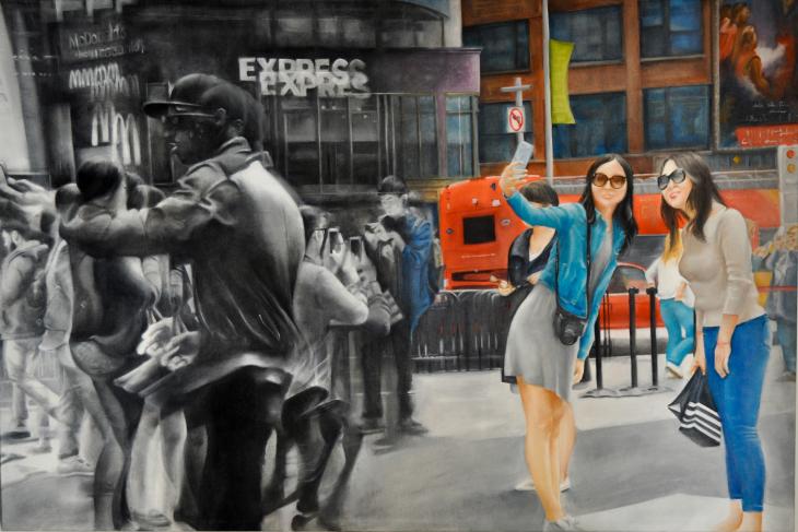 In questo spazio, l’identità posa per essere costruita e mostrata al mondo, come se passasse da un’intangibile anonima idea, confusa tra il tremolante grigiore della folla, alla concretezza individuale, unica e brillante come gli accesi colori che si impongono alla prima metà del quadro in una tensione che si dissolve una volta riconosciuta in essa la nostra natura in società.
