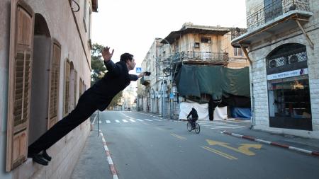 The video leap of faith starts with a shot of the artist wearing a suit, standing on the window’s edge, getting ready to make the leap of his life to the wide open space. The artist is hesitating, having difficulties in creating a momentum to jump, but eventually jumps. Surprisingly he freezes horizontally, while his feet touch the window’s edge - a homage to the known work of Yves Klein "Artist jumps into the void (1959). When the shot opens up it appears that the window from which the artist was afraid to jump is just a few feet above ground. The camera stands still presenting a grotesque and surreal image of the artist hanging between heaven and earth.